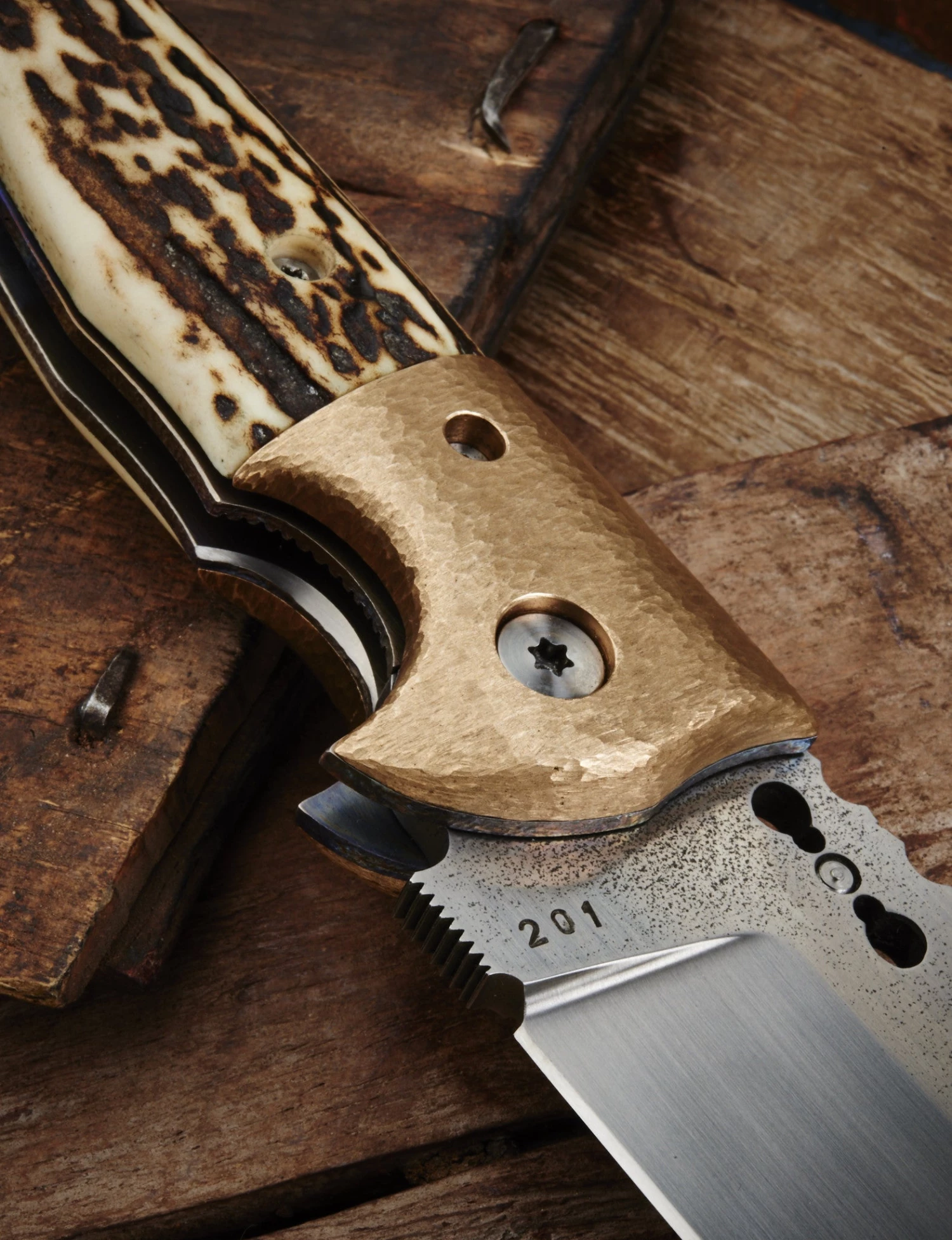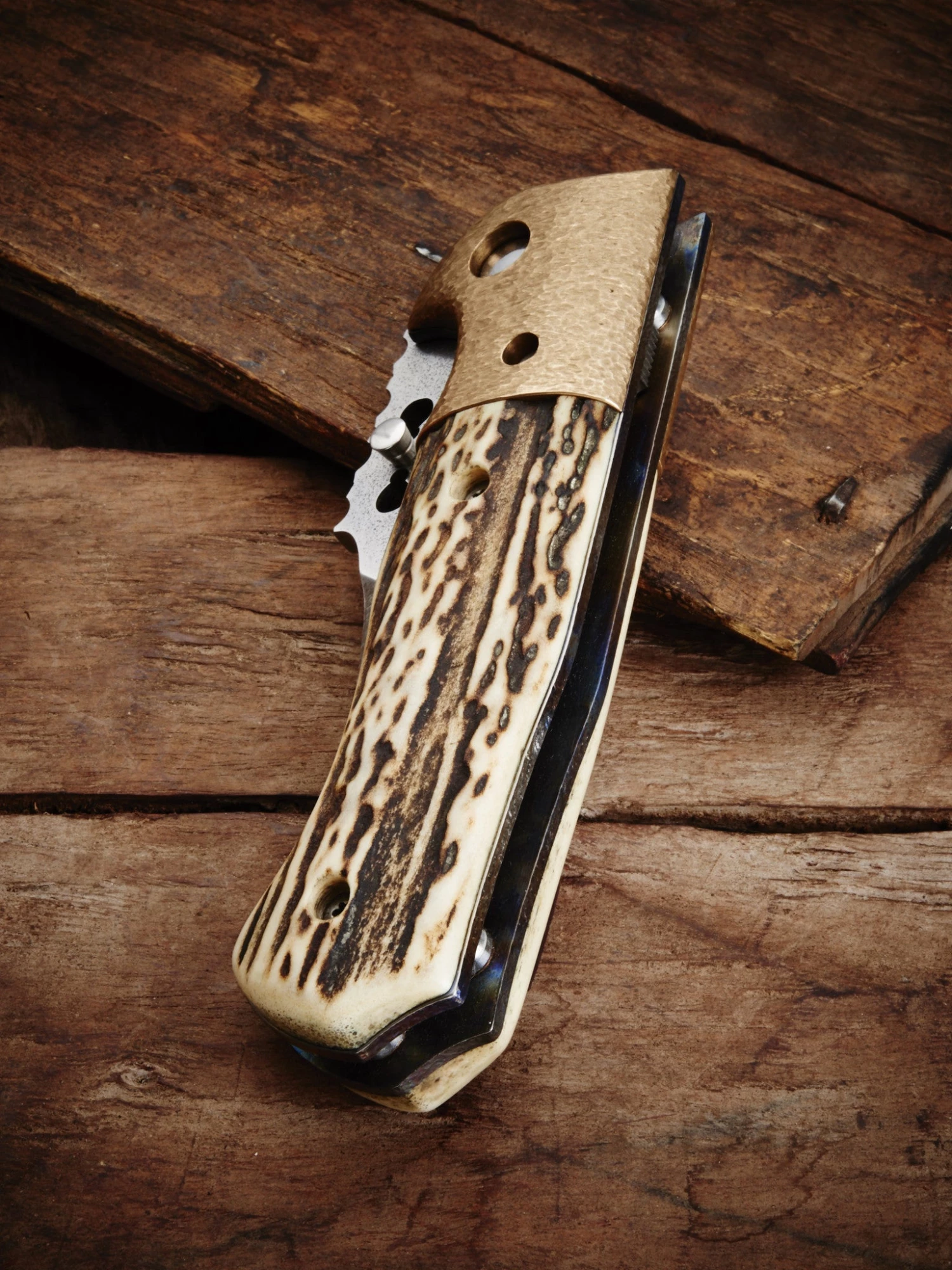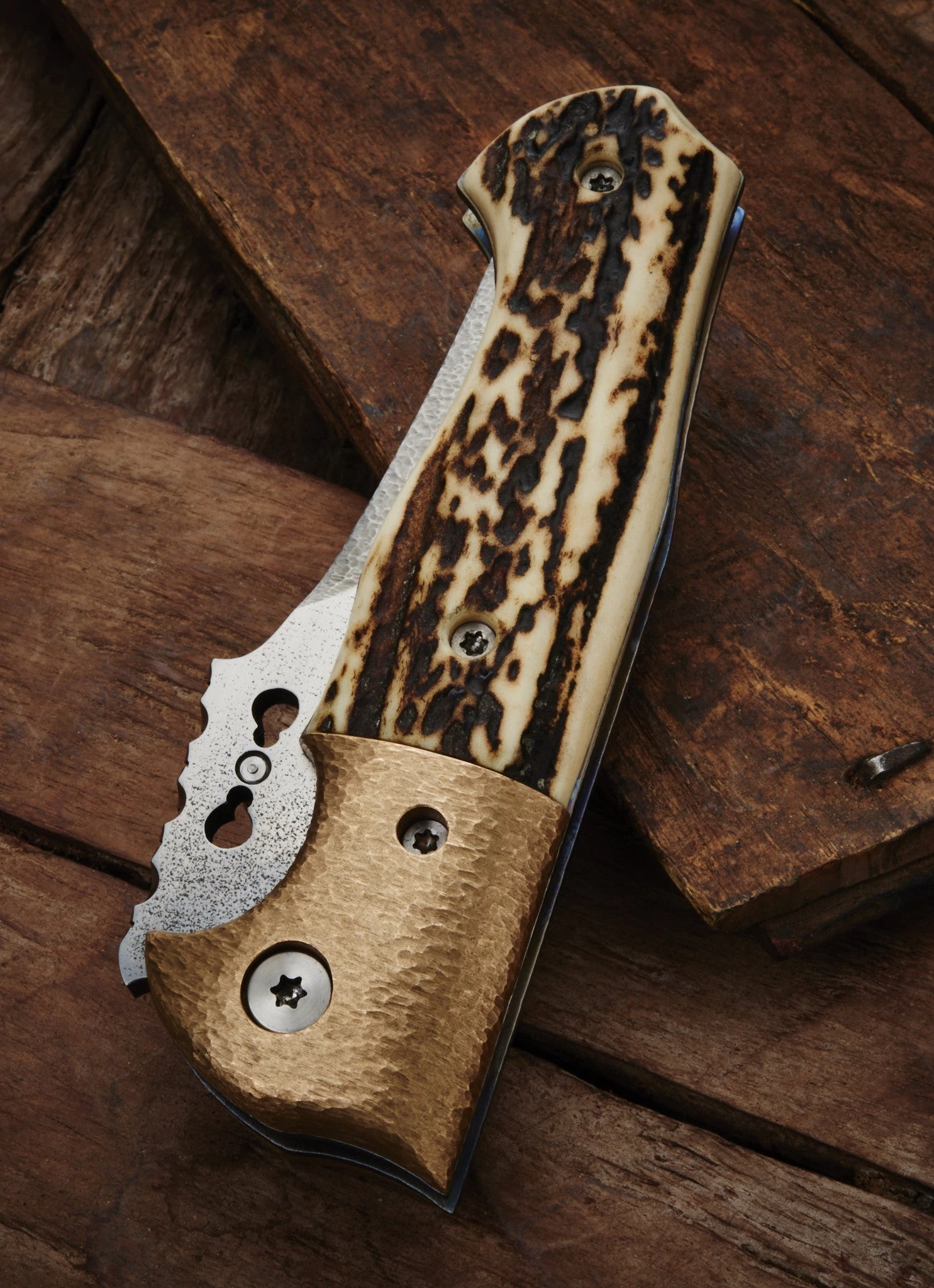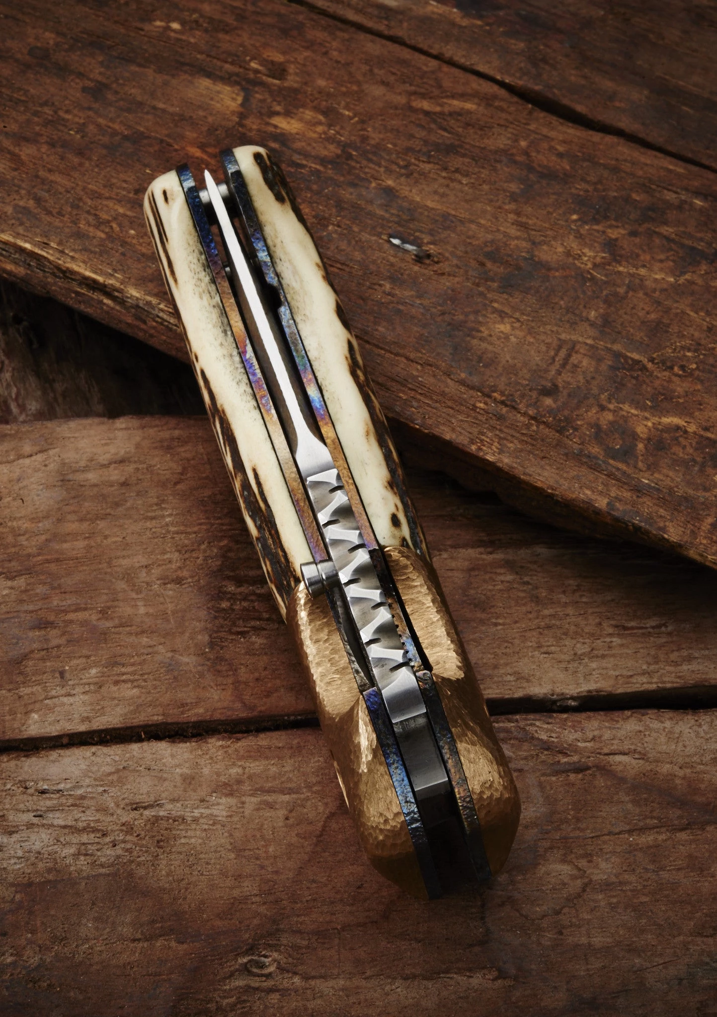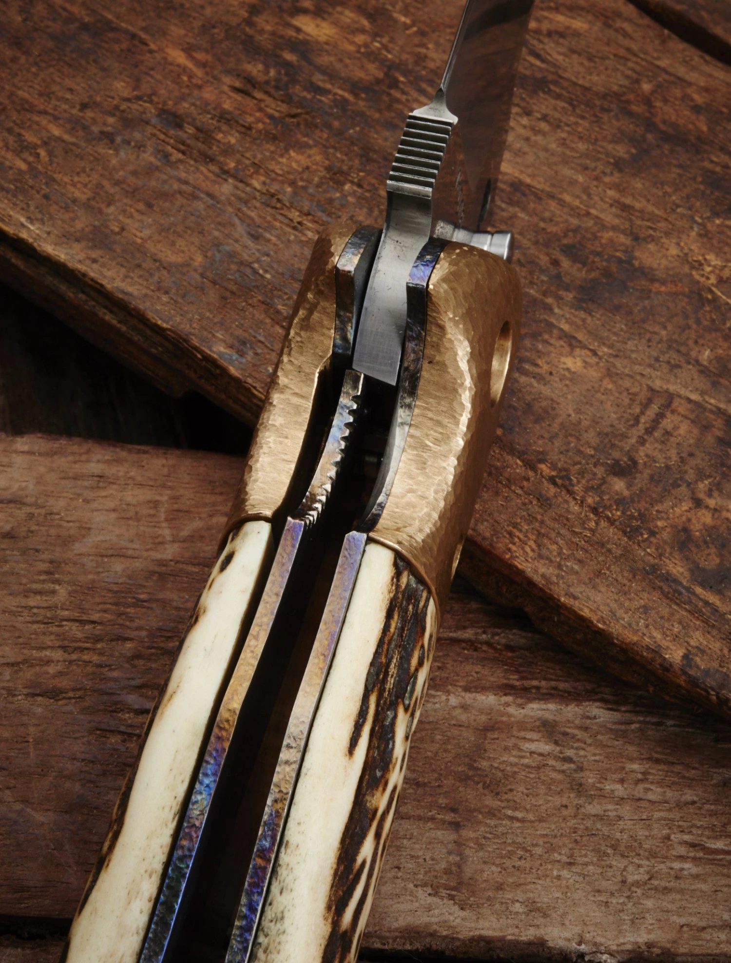 Handle – 5.5″ Anodized Bronze Titanium Liners with Hammered Copper Bolsters and Stag Scales.