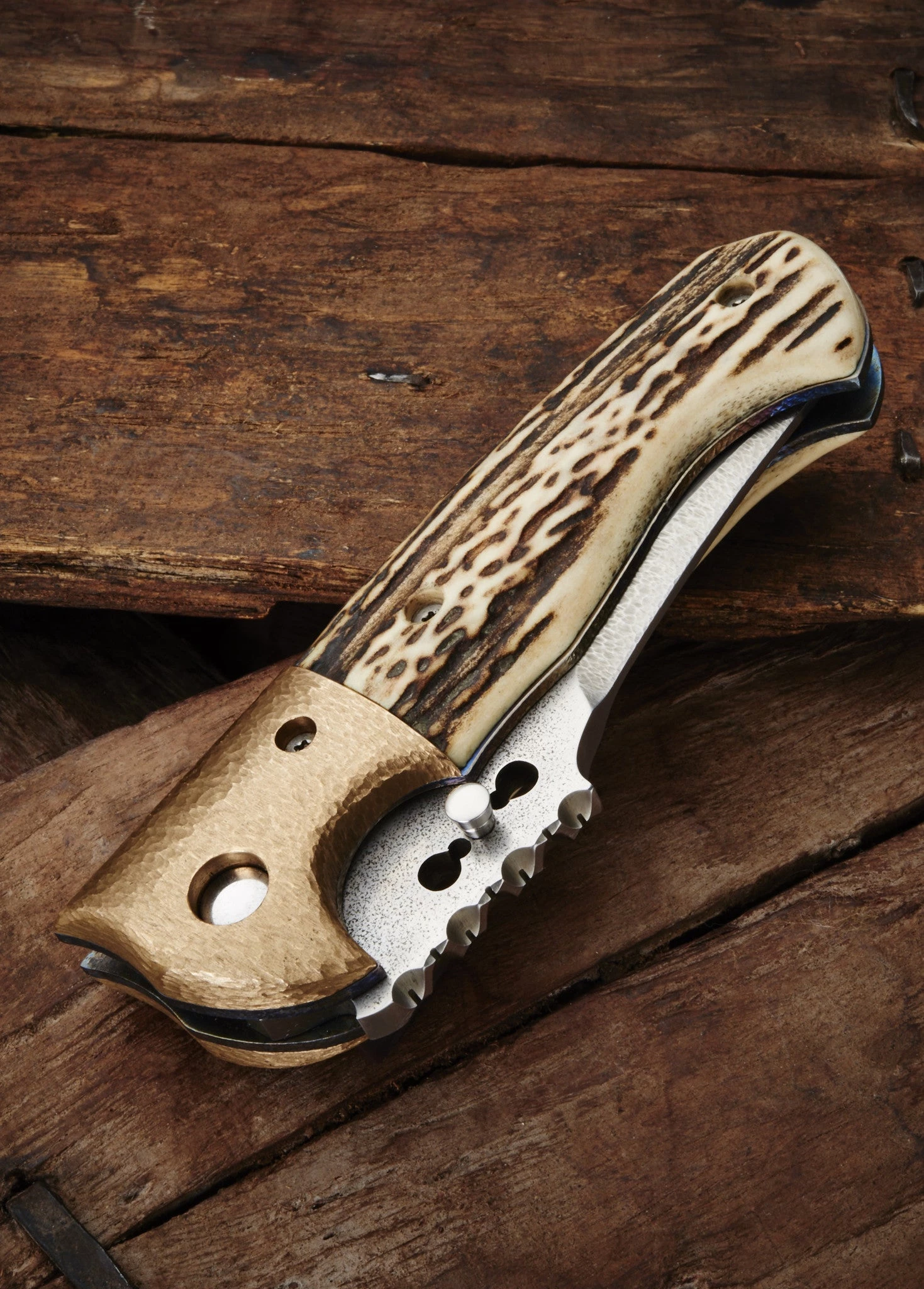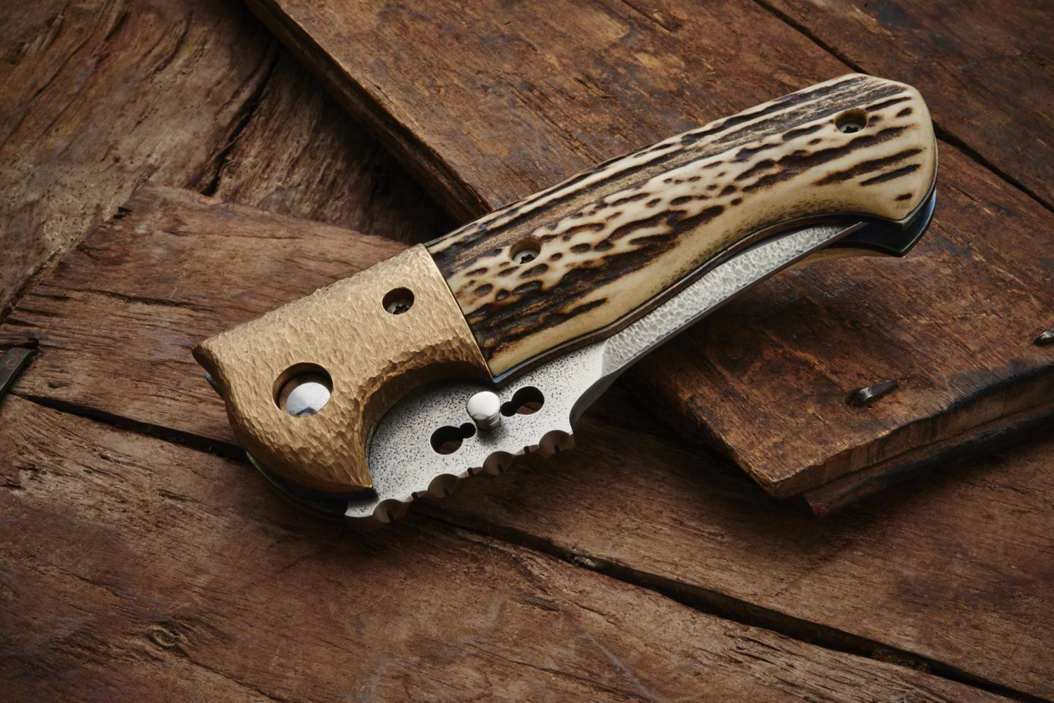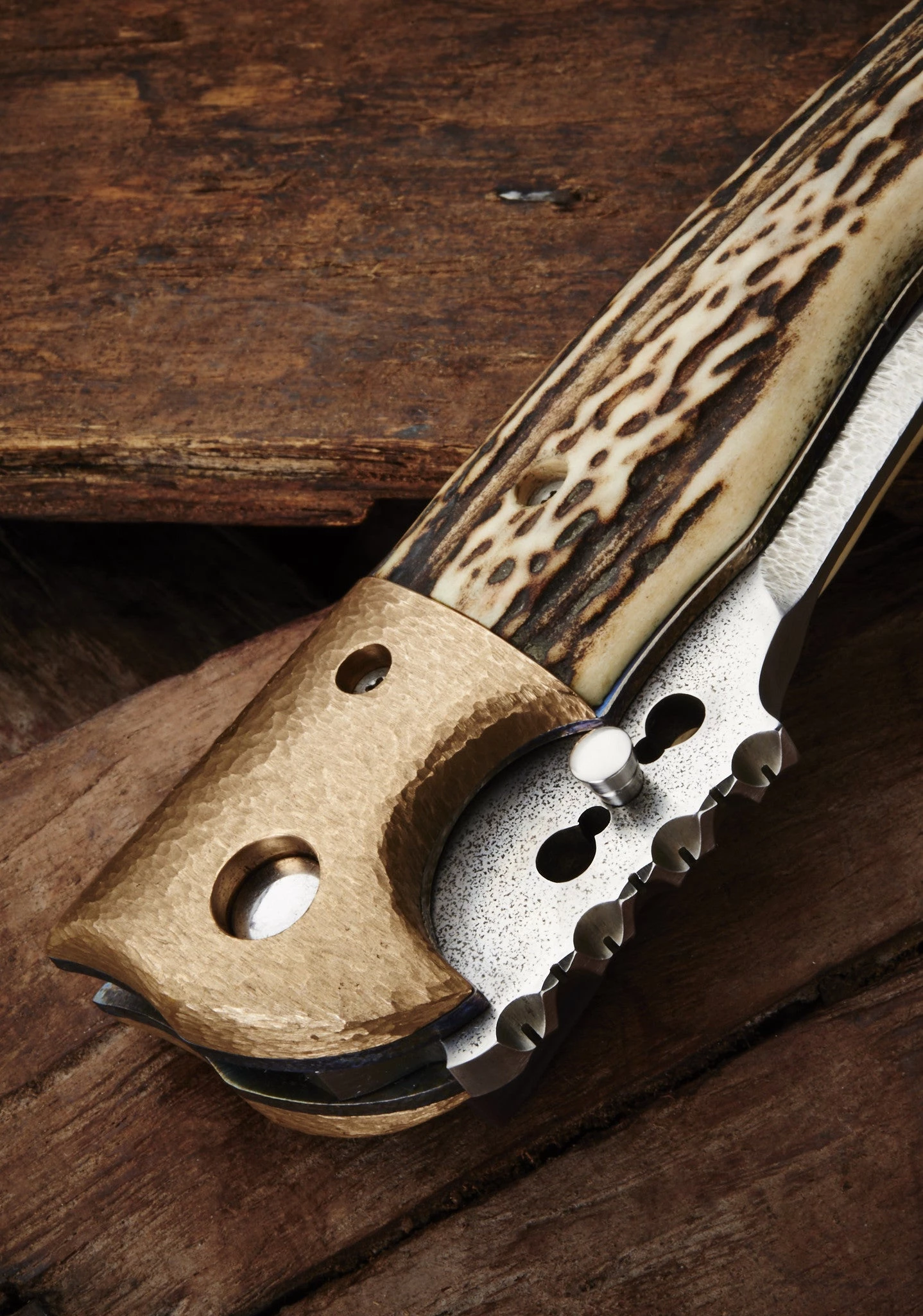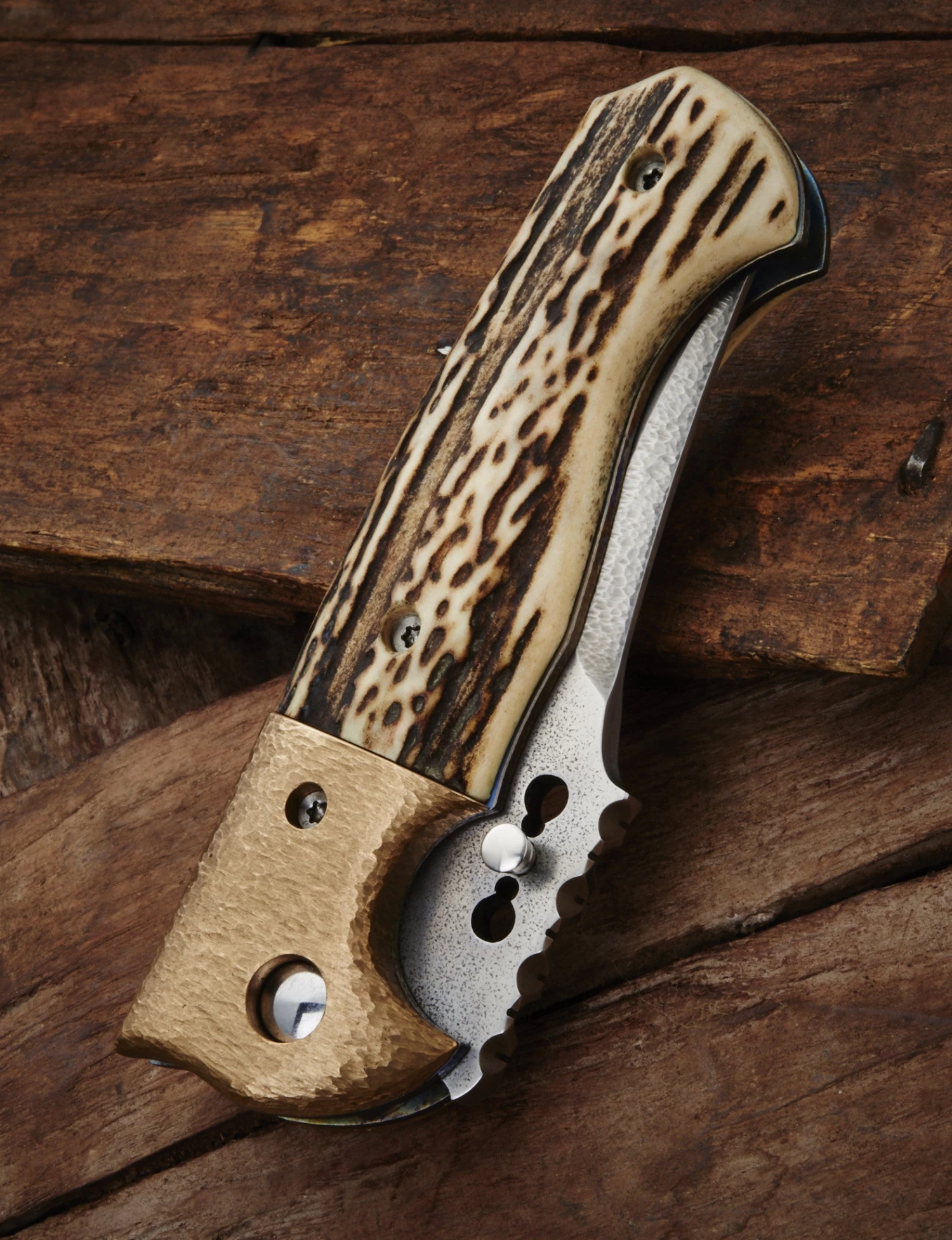 Handle – 5.5″ Anodized Bronze Titanium Liners with Hammered Copper Bolsters and Stag Scales.
