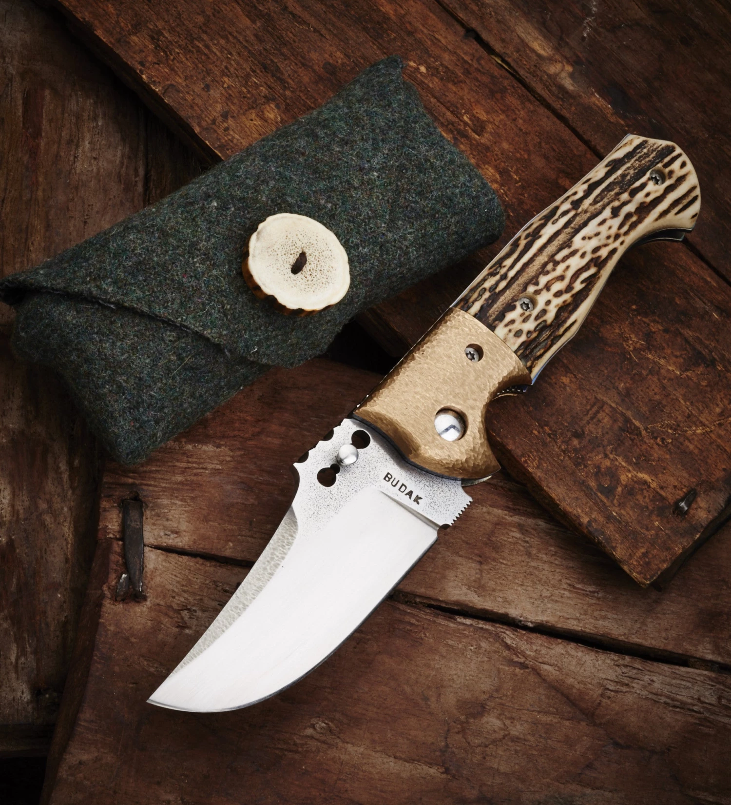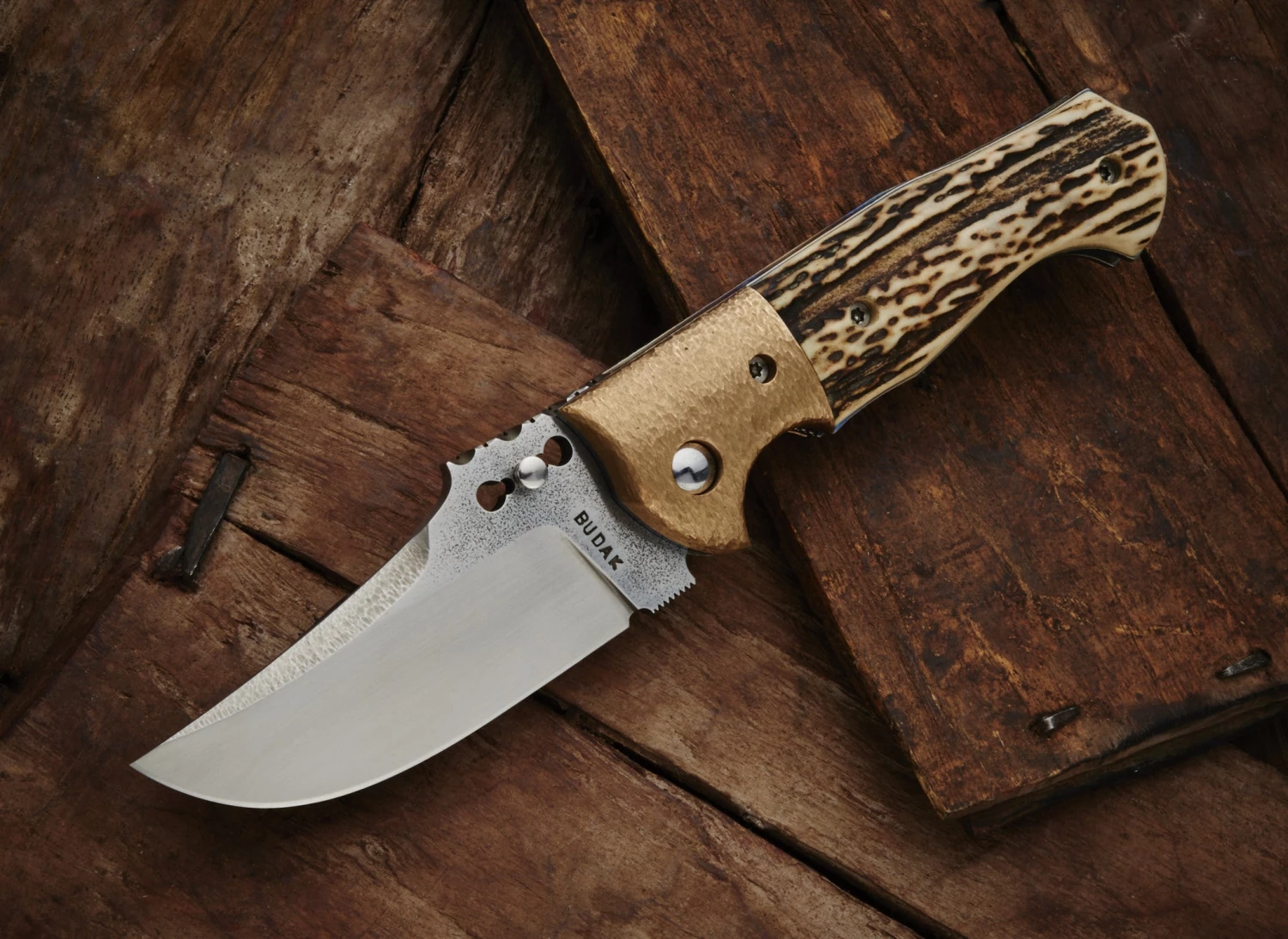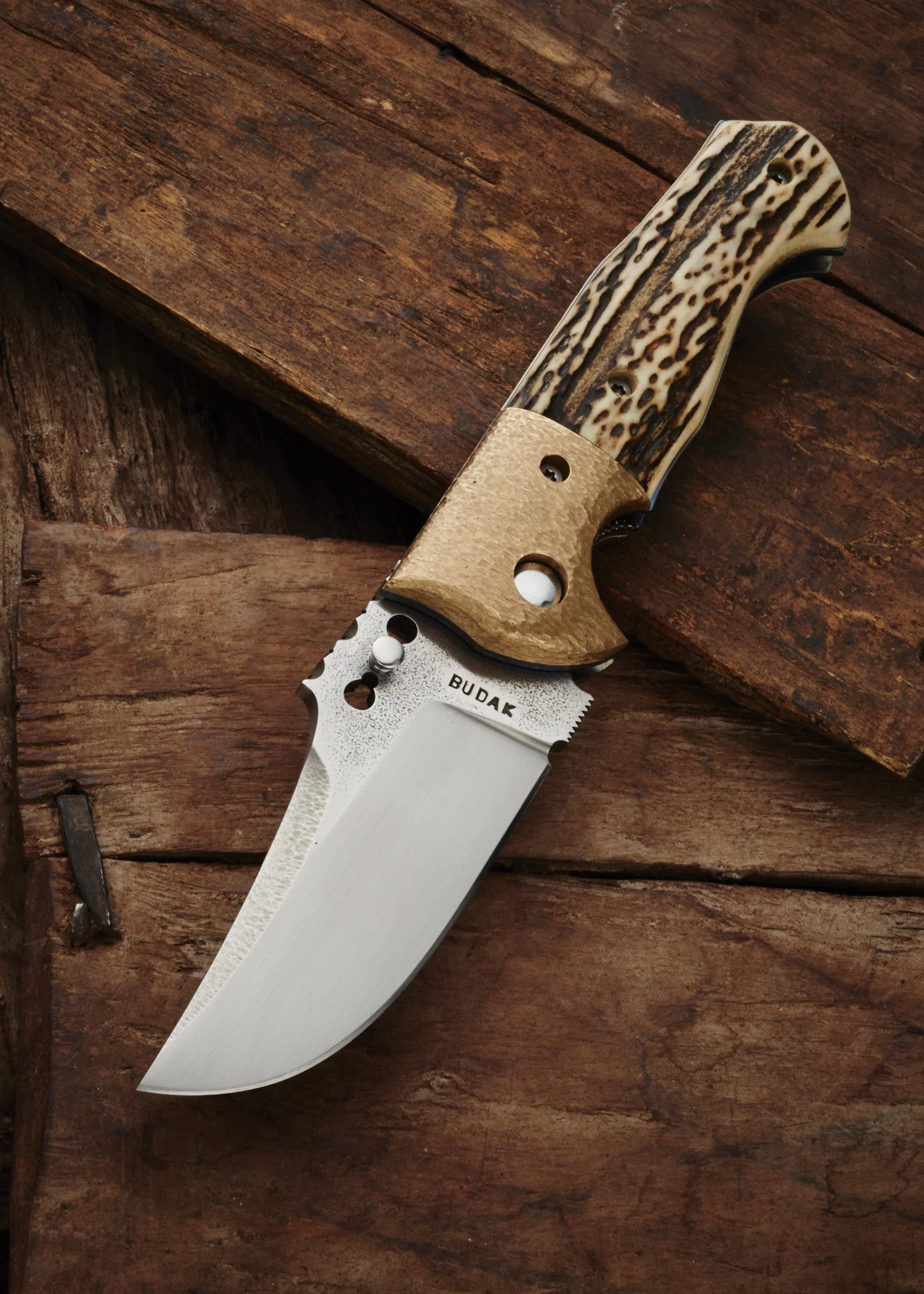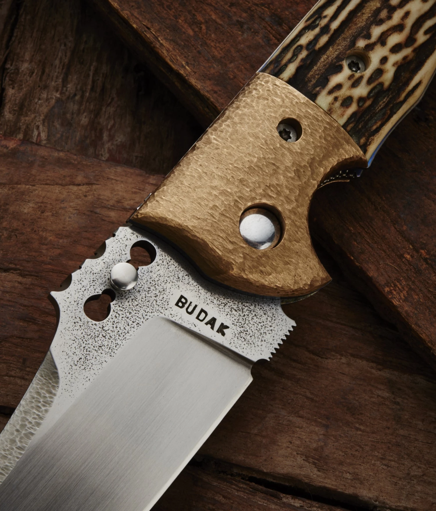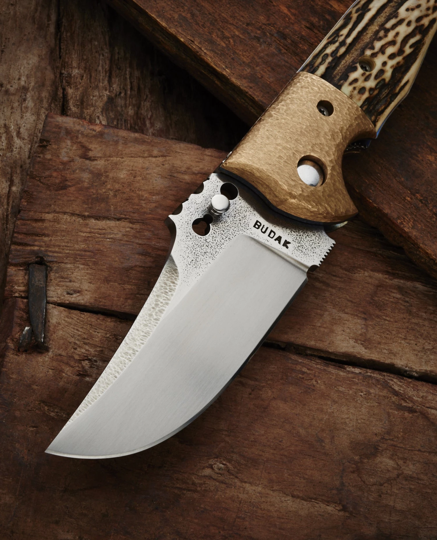 Handle – 5.5″ Anodized Bronze Titanium Liners with Hammered Copper Bolsters and Stag Scales.