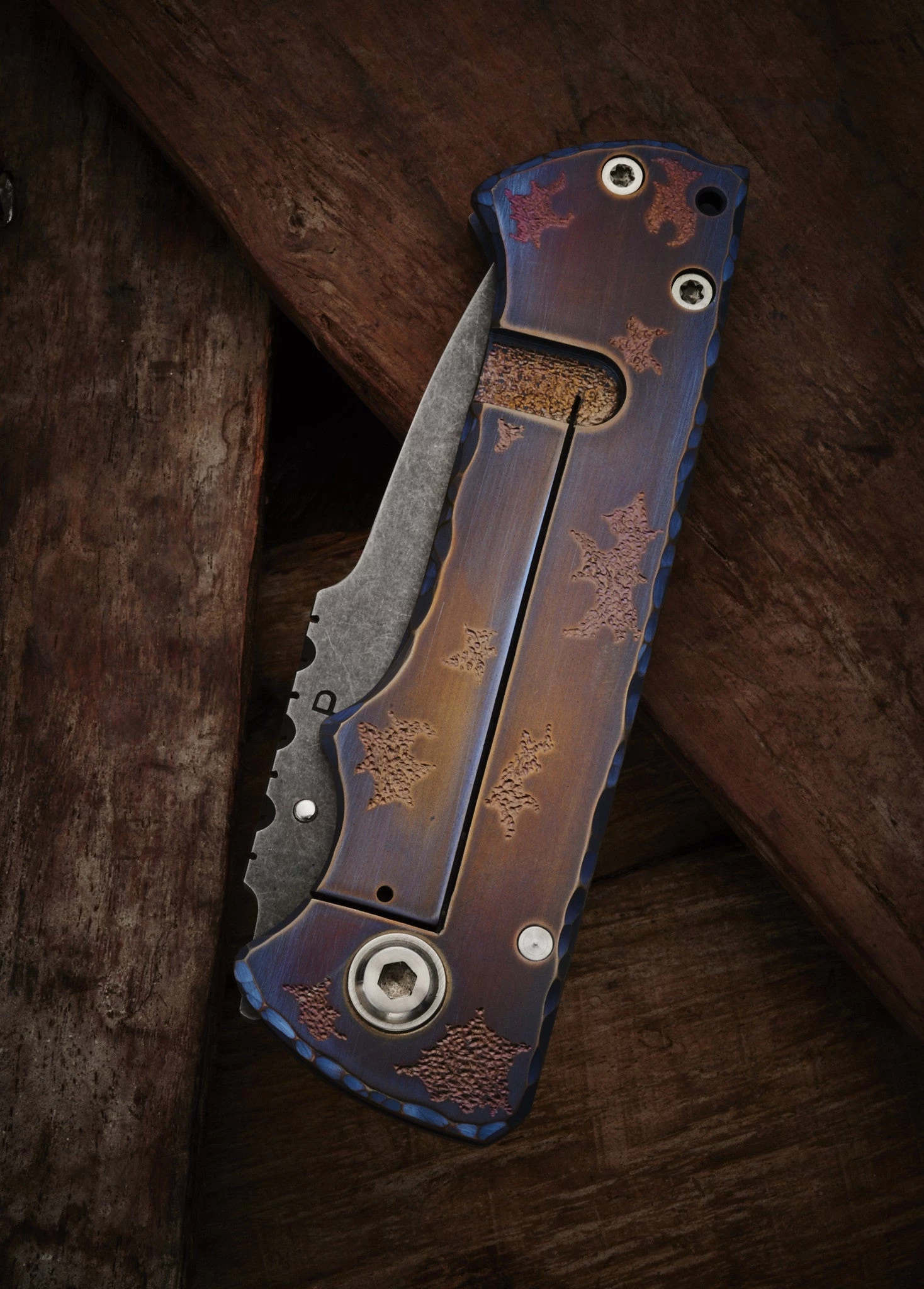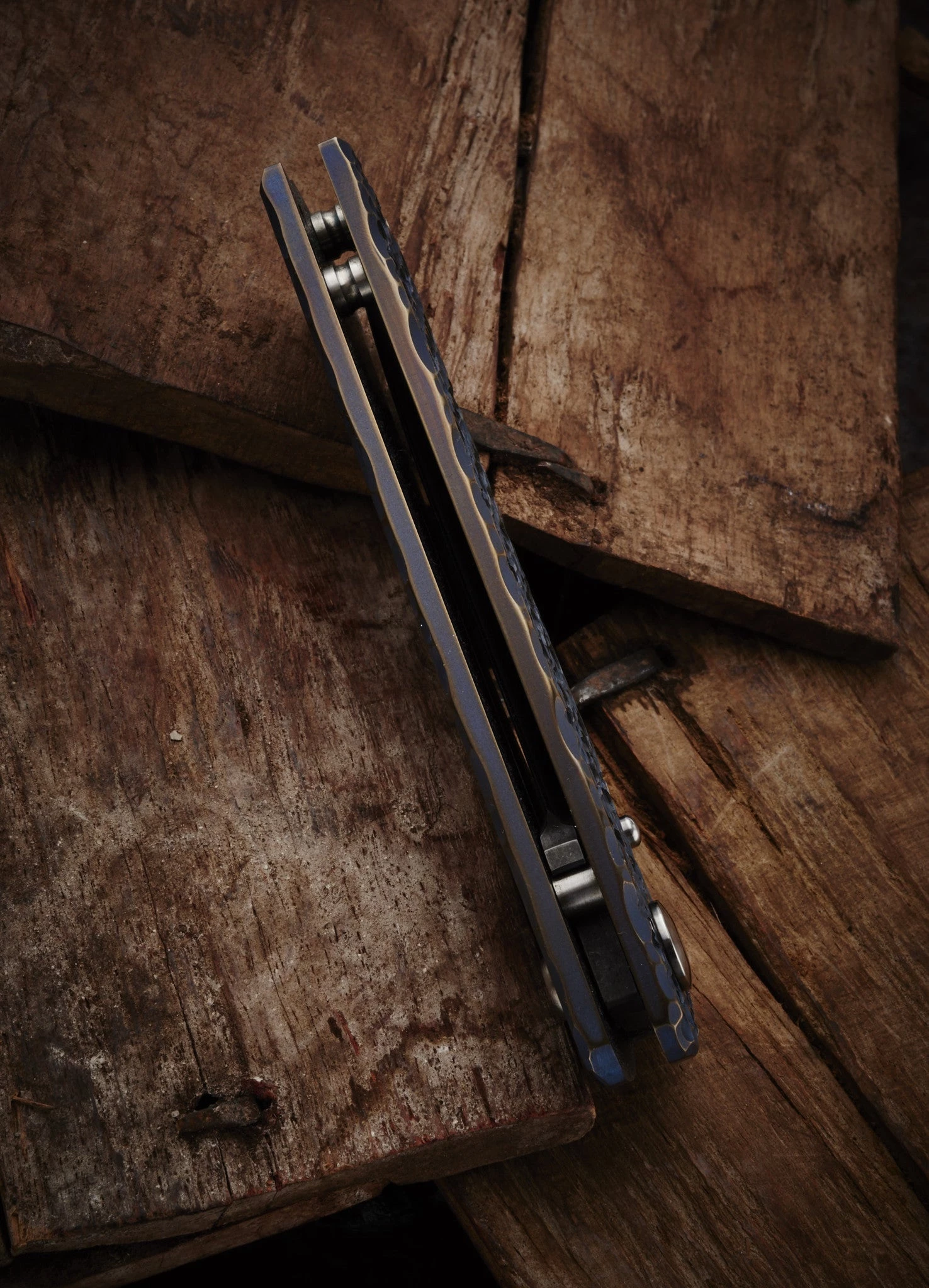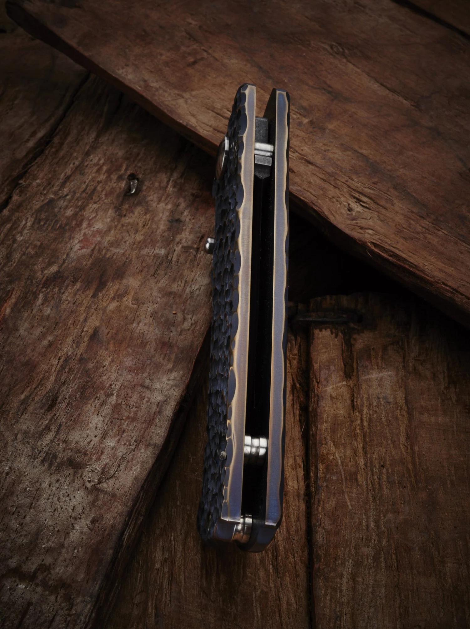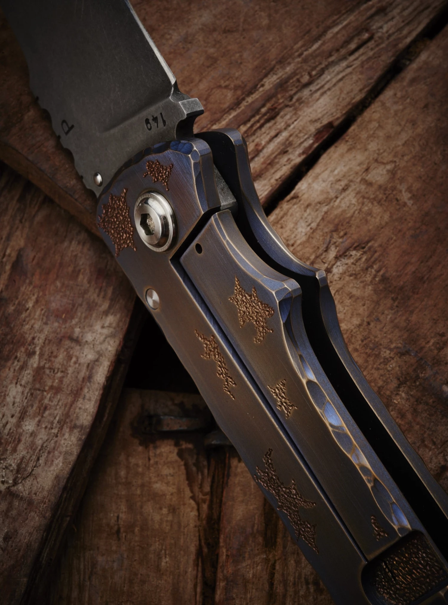 Handle – 5″ Anodized Titanium construction. Cratered Show Scale and Hand Sculpted Lock Side