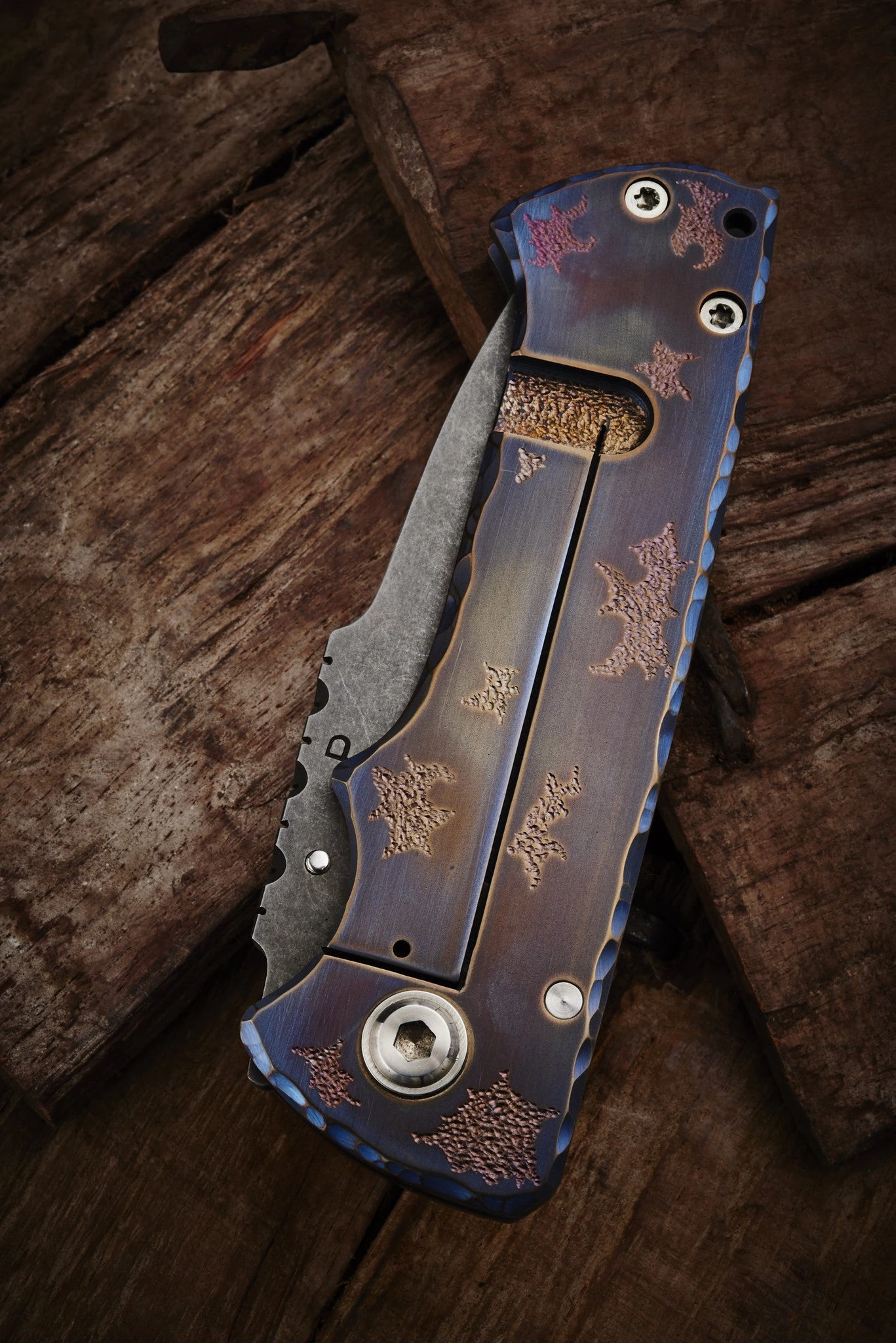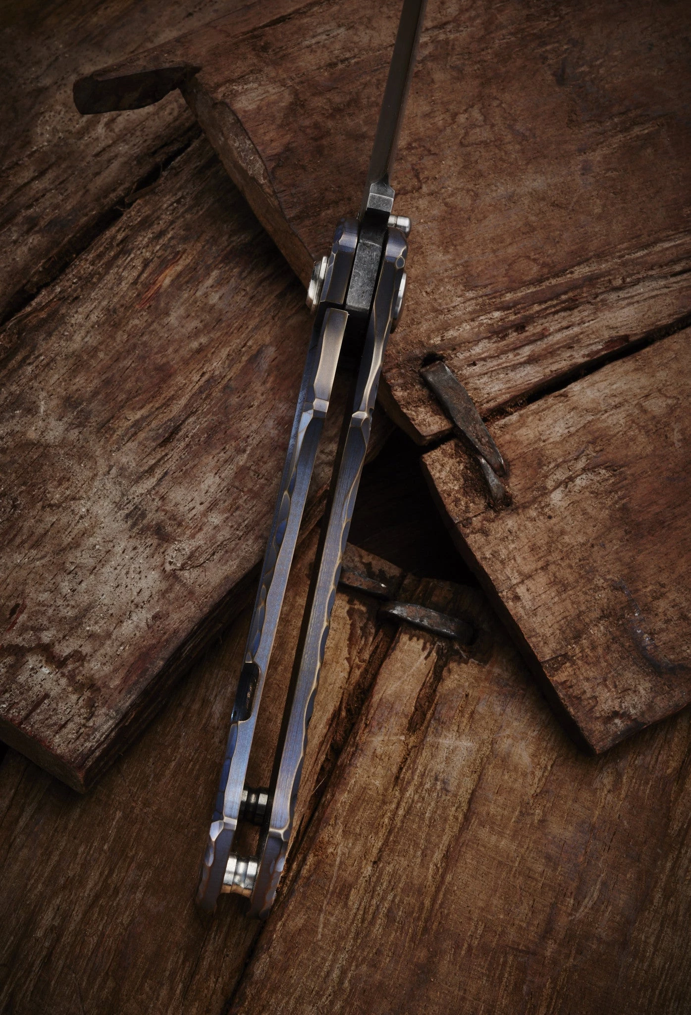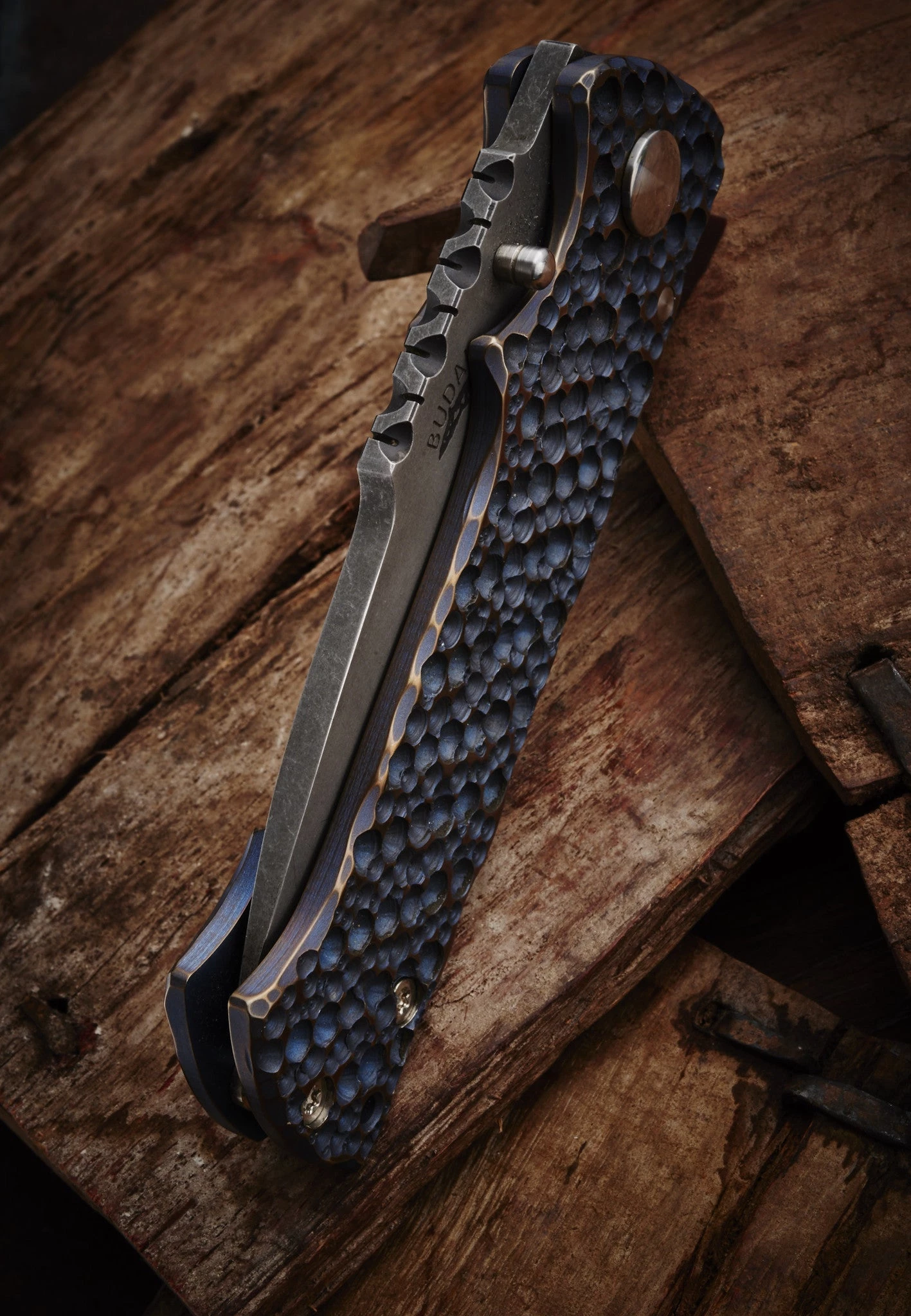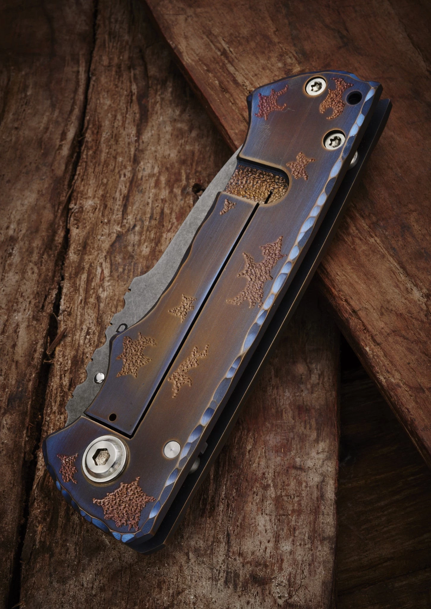 Handle – 5″ Anodized Titanium construction. Cratered Show Scale and Hand Sculpted Lock Side
