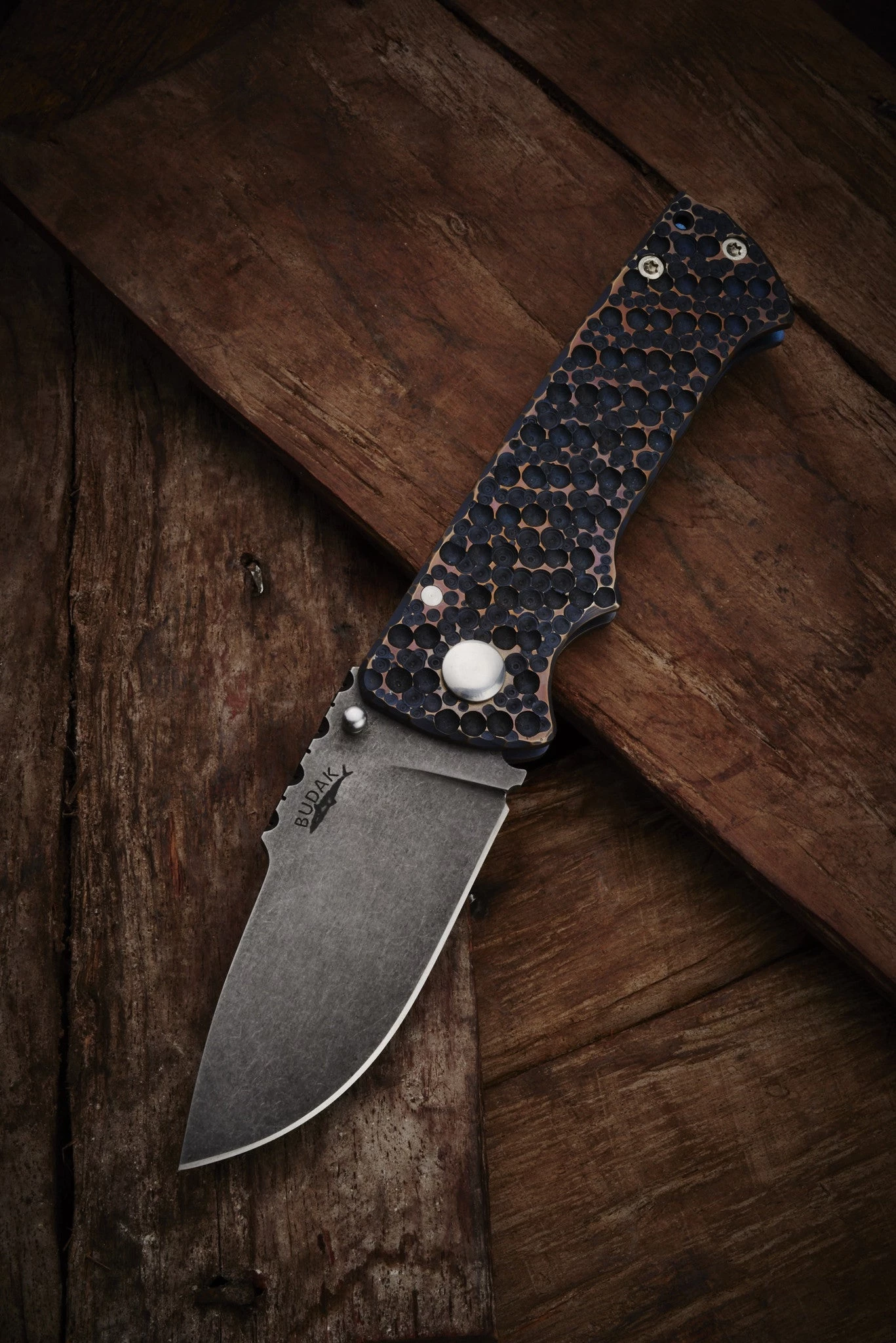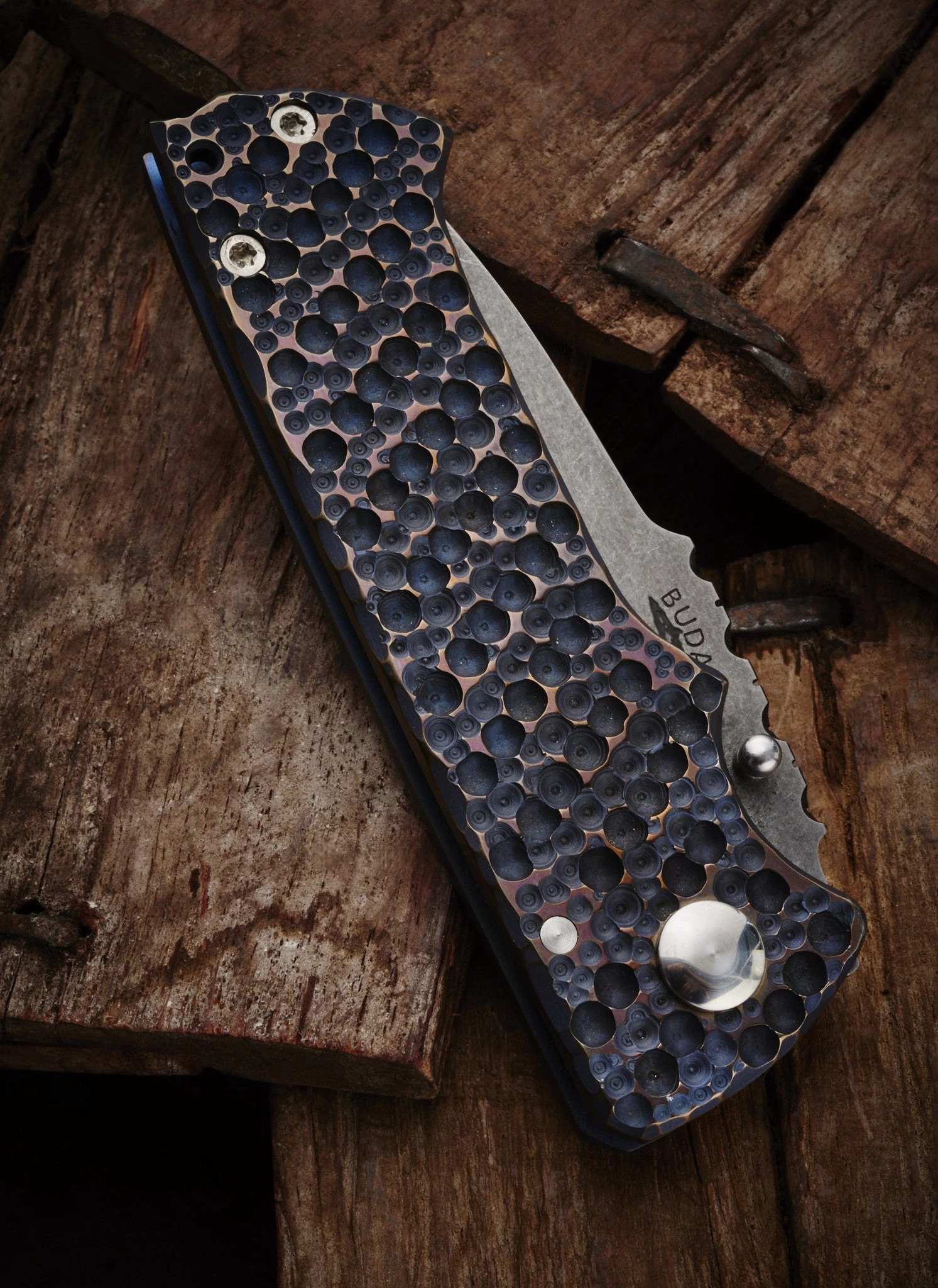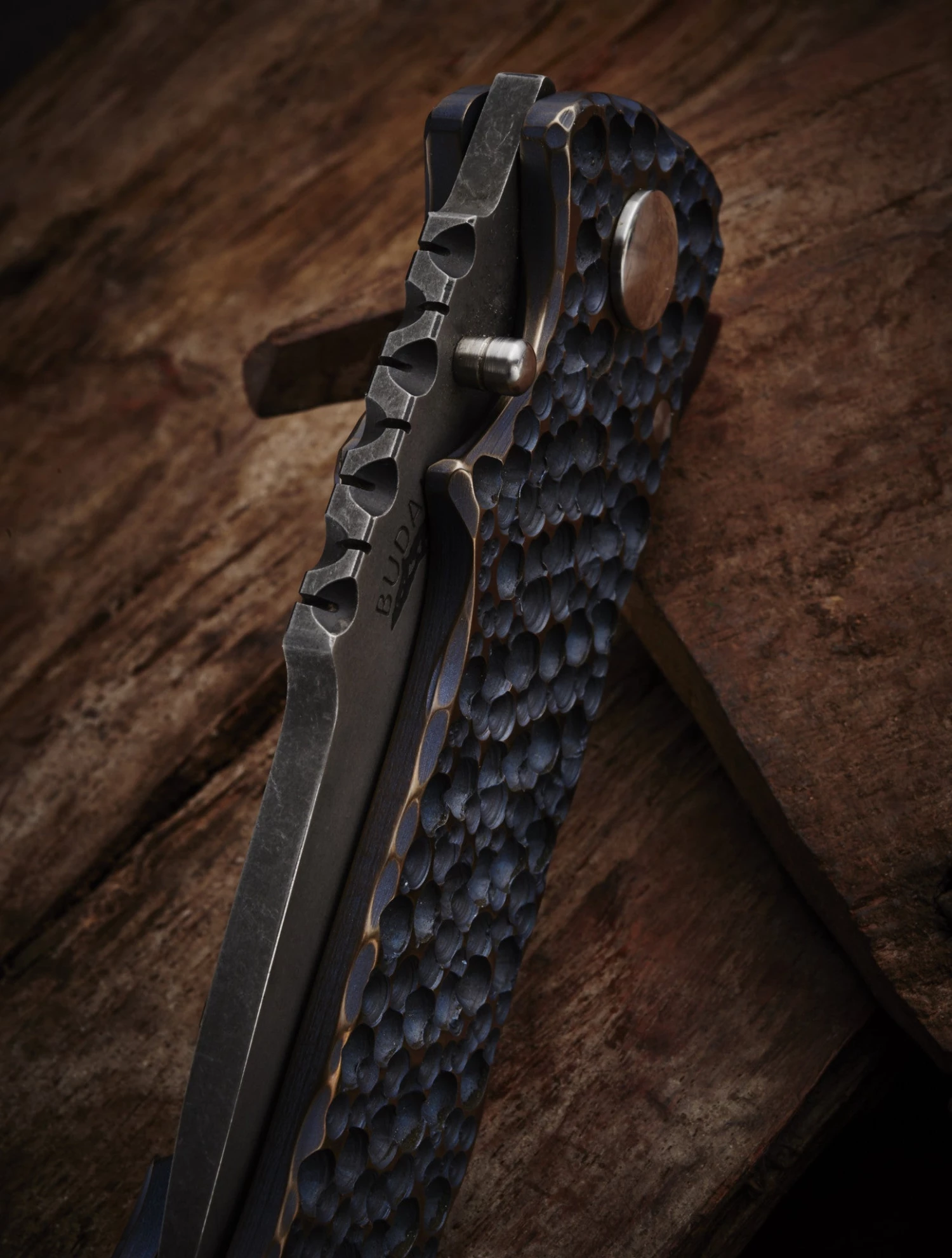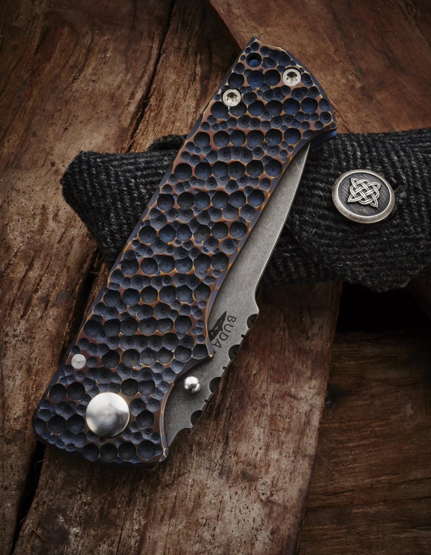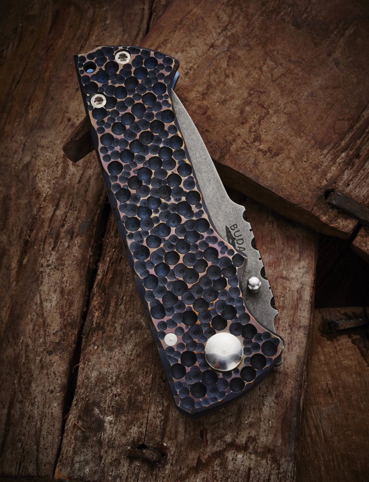 Handle – 5″ Anodized Titanium construction. Cratered Show Scale and Hand Sculpted Lock Side
