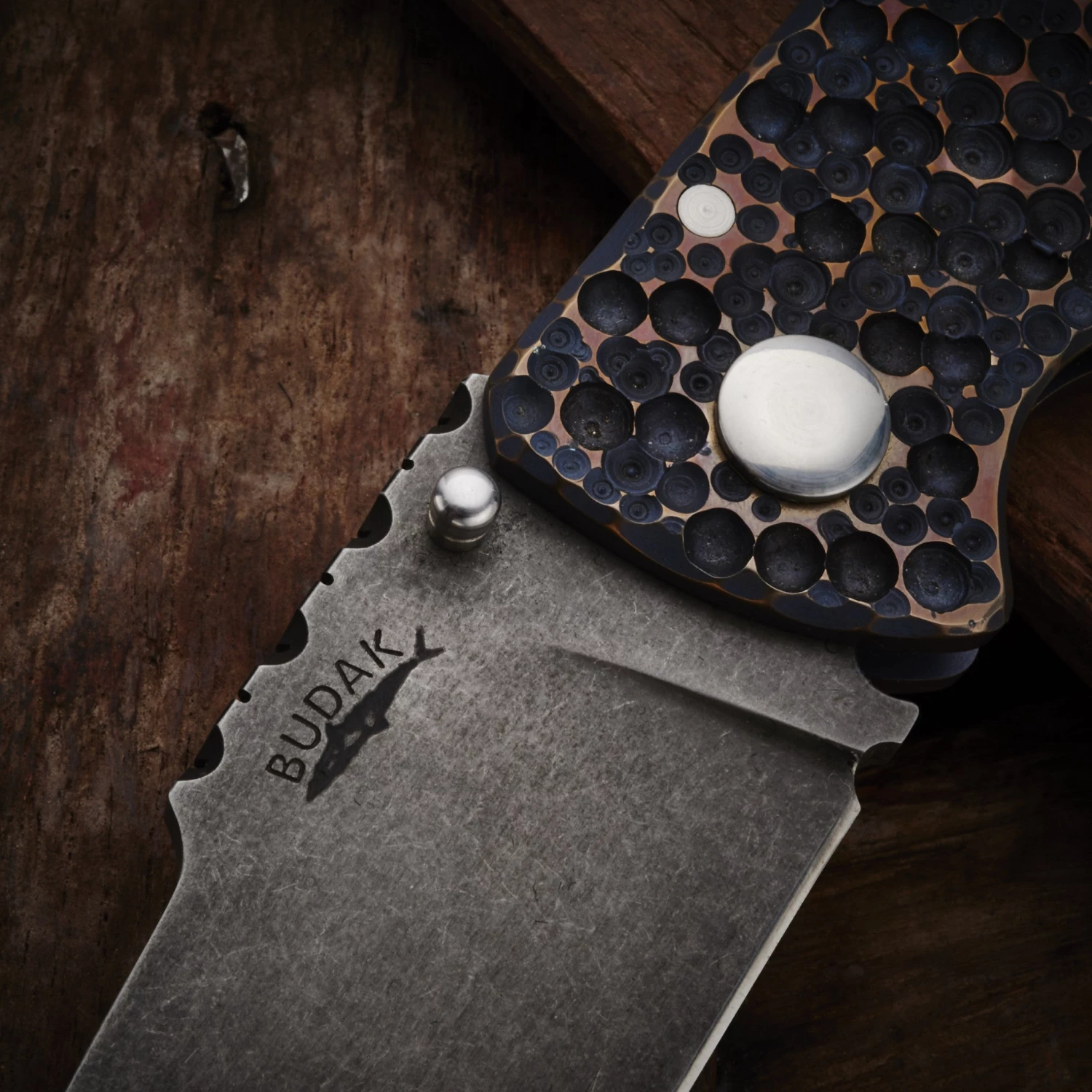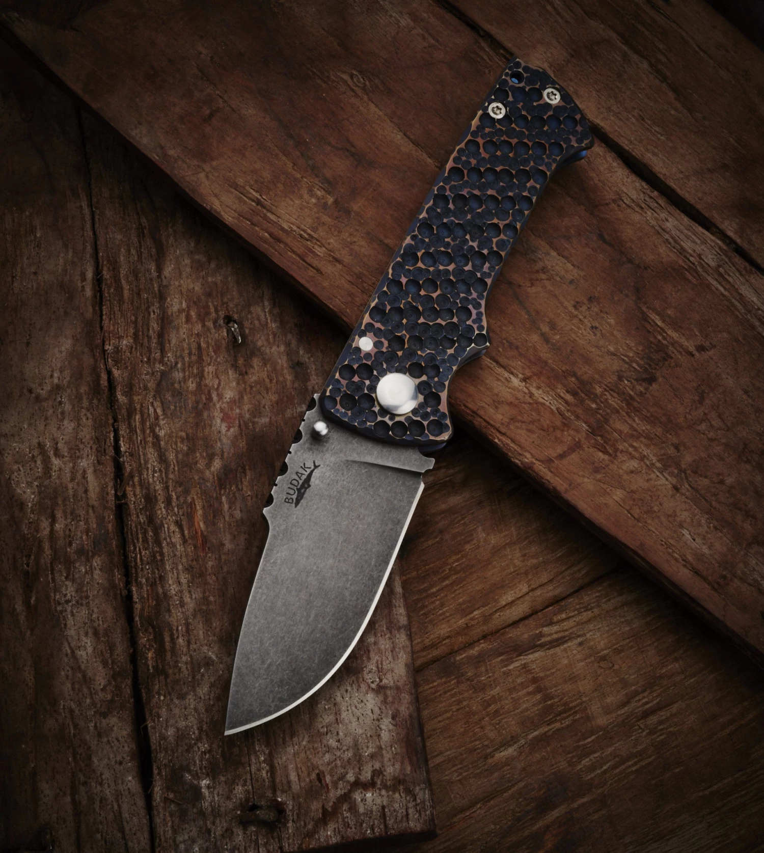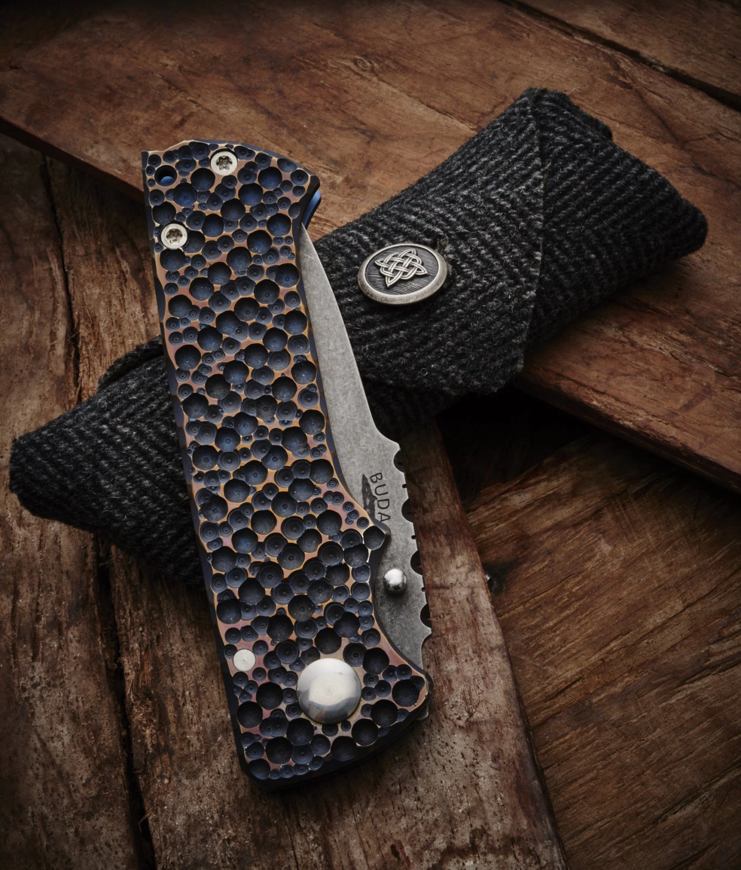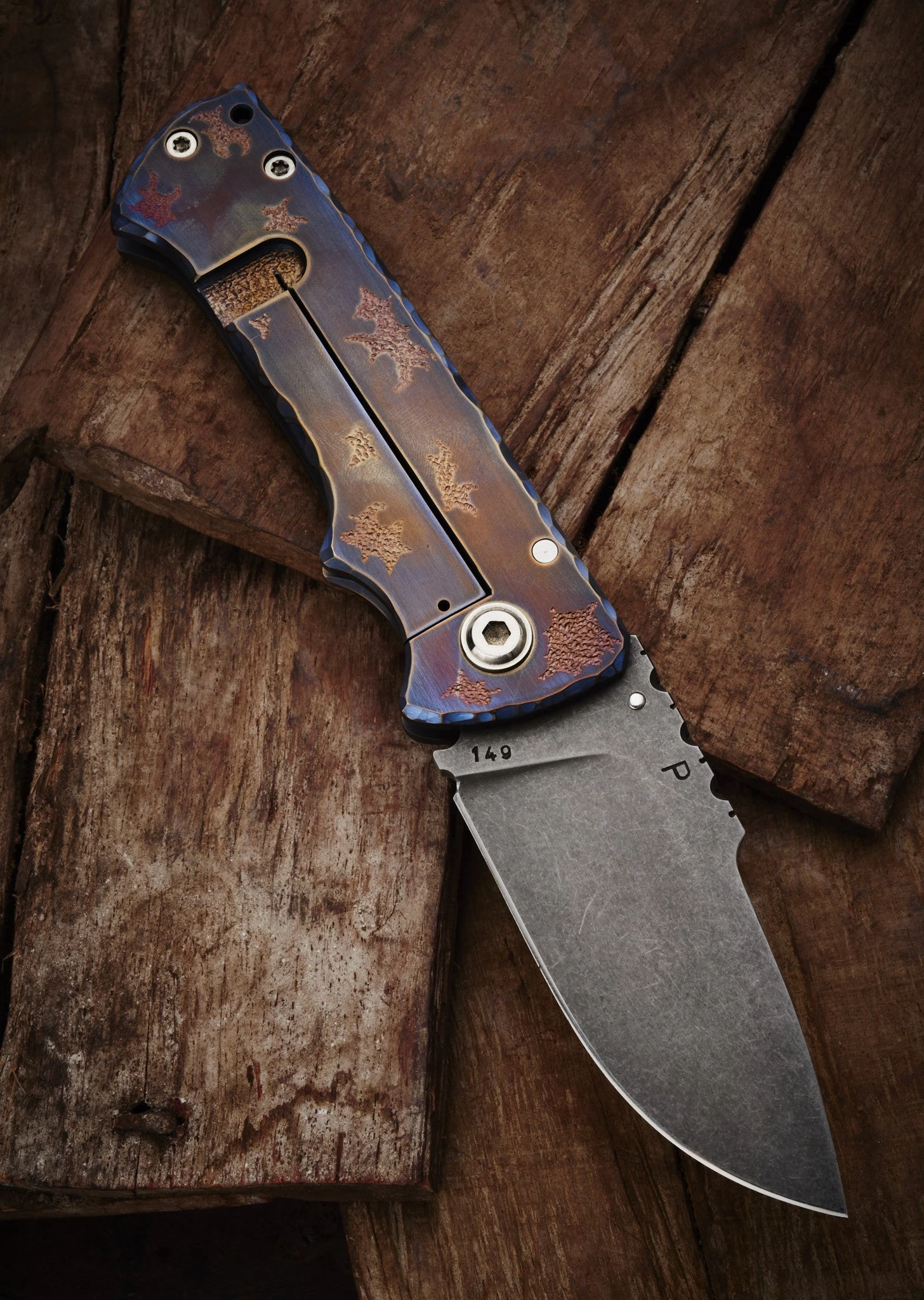 Handle – 5″ Anodized Titanium construction. Cratered Show Scale and Hand Sculpted Lock Side