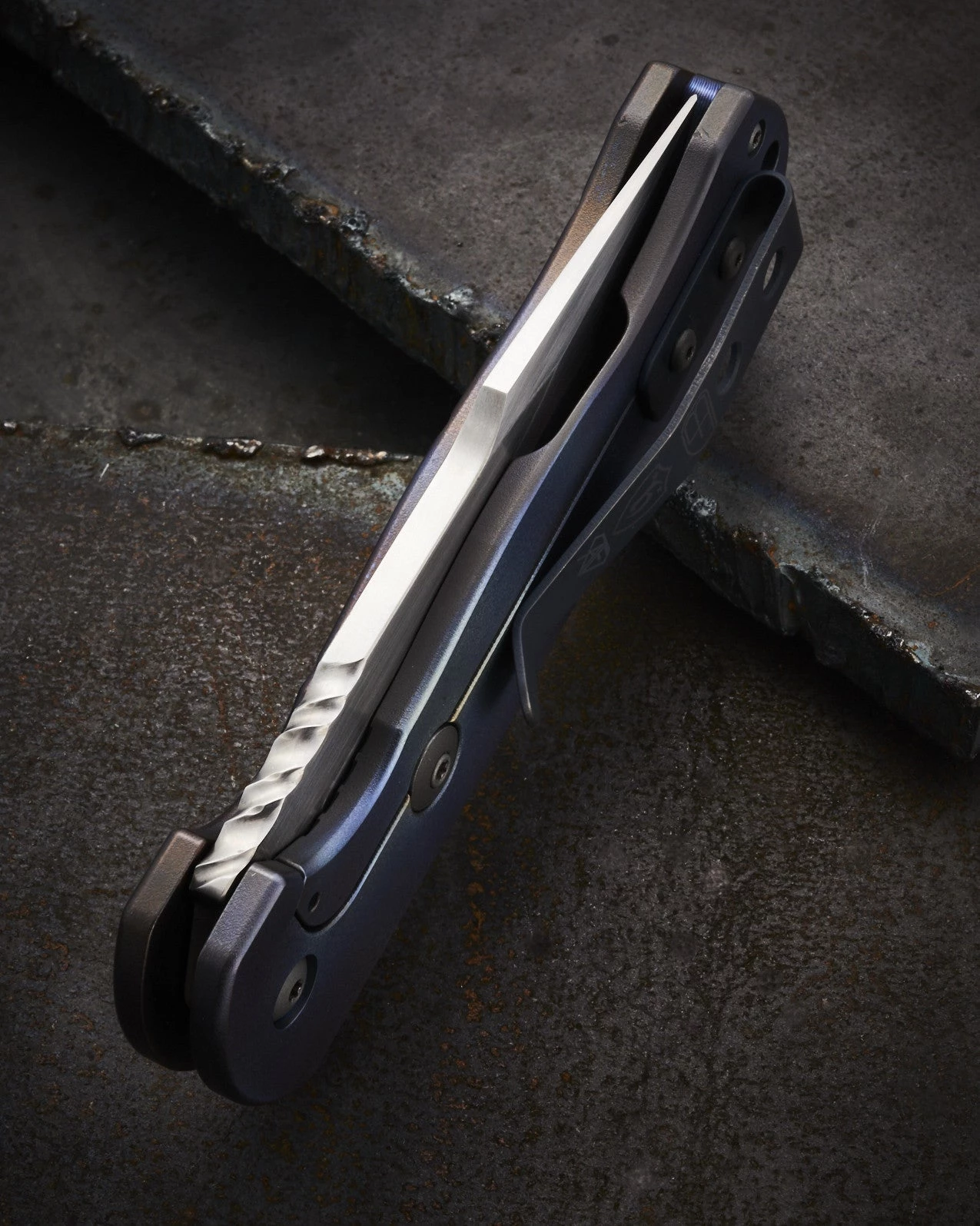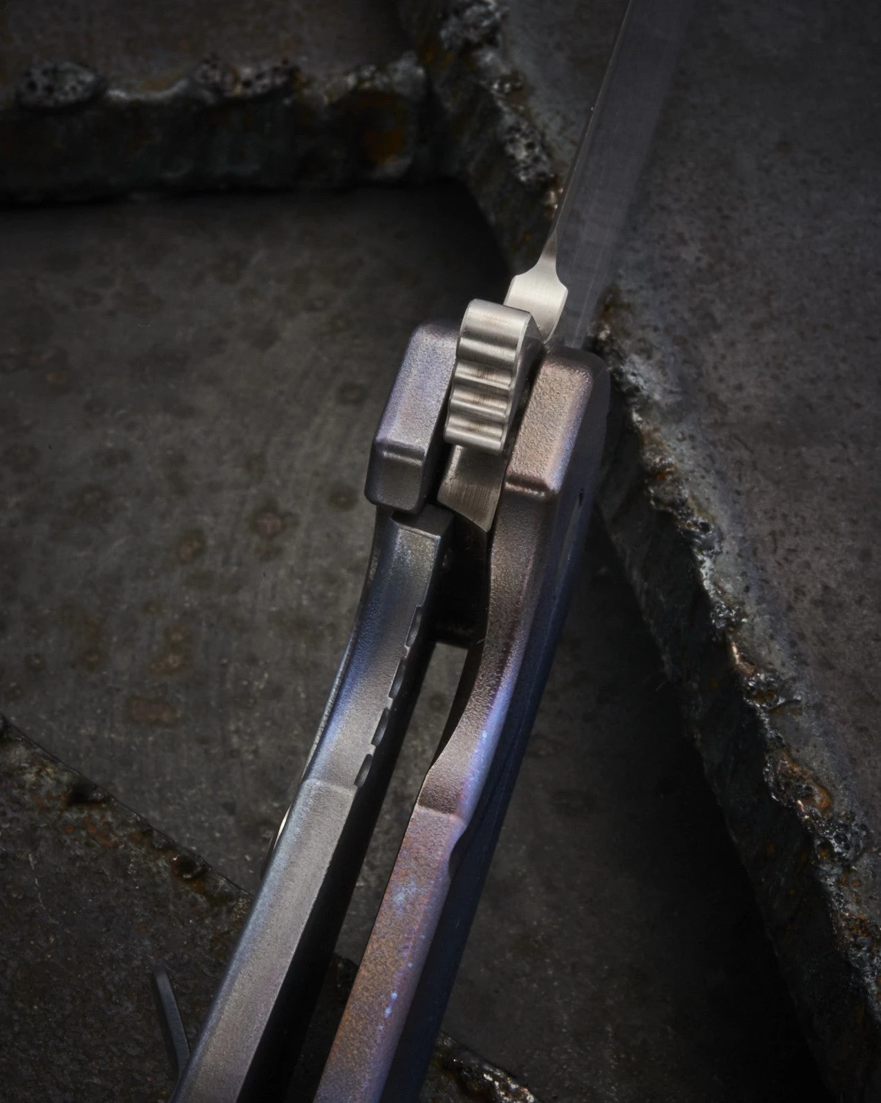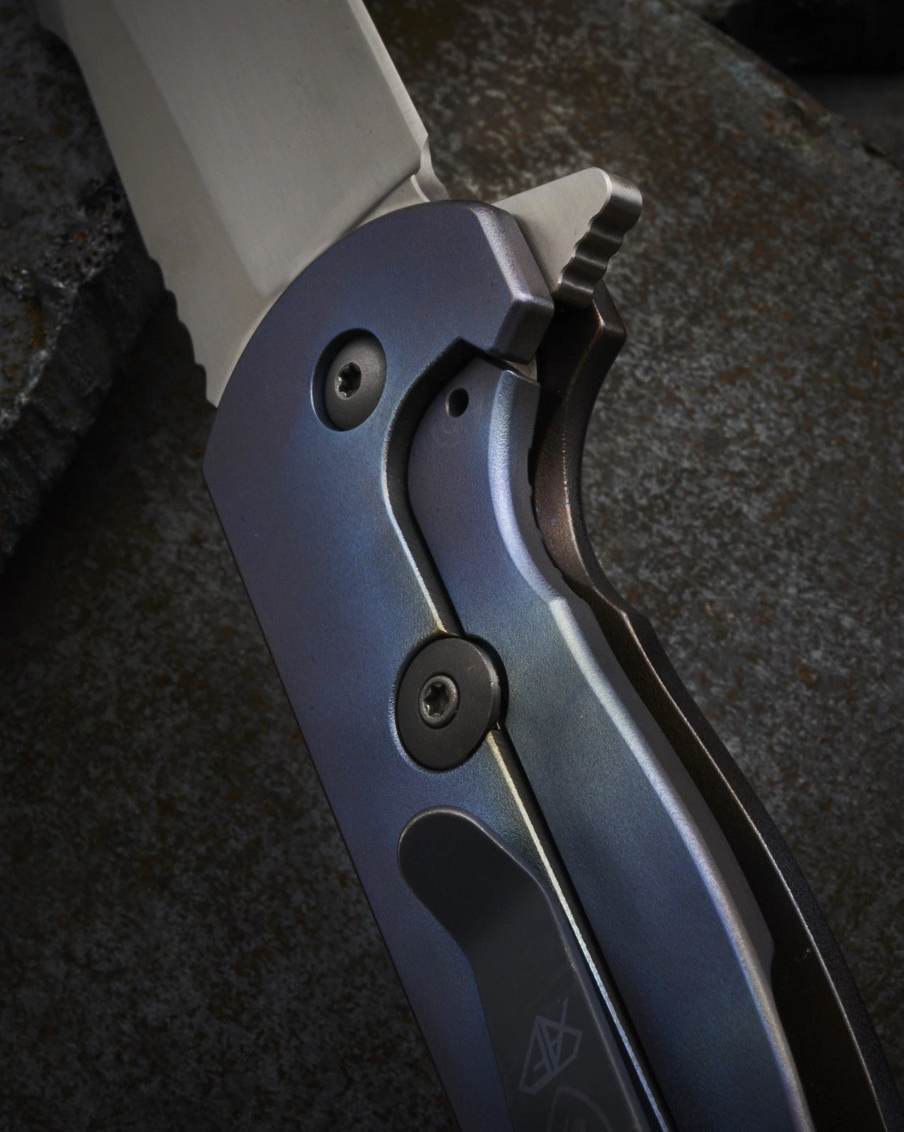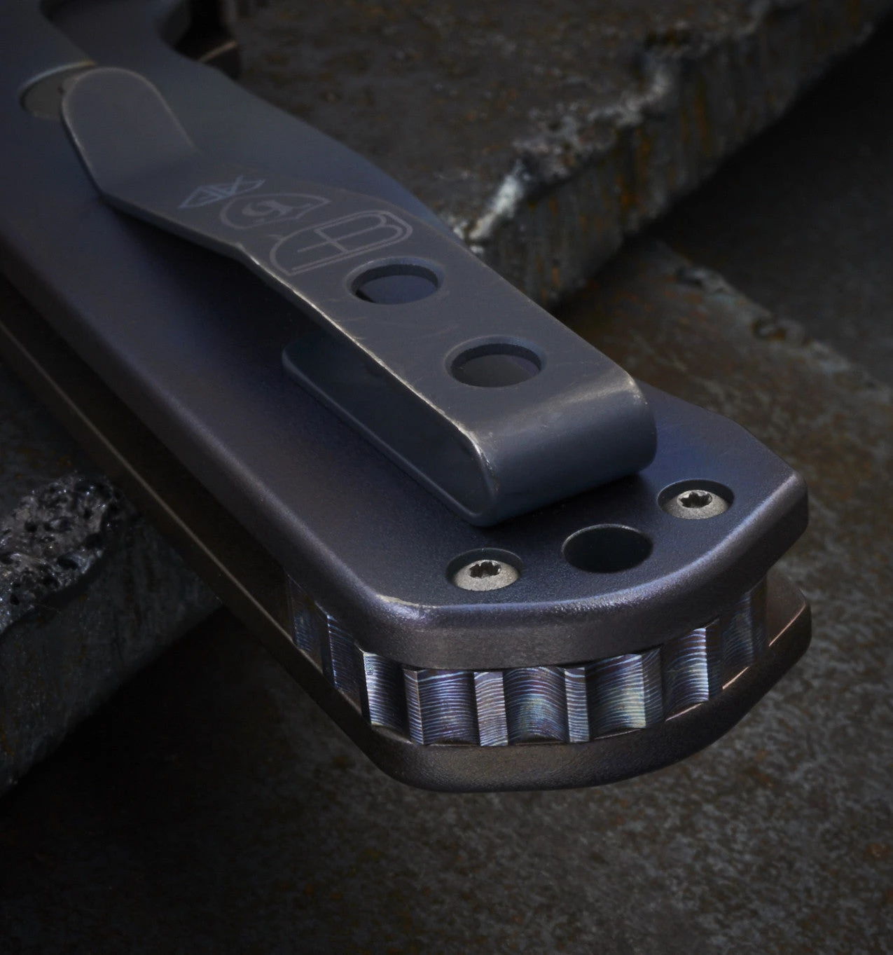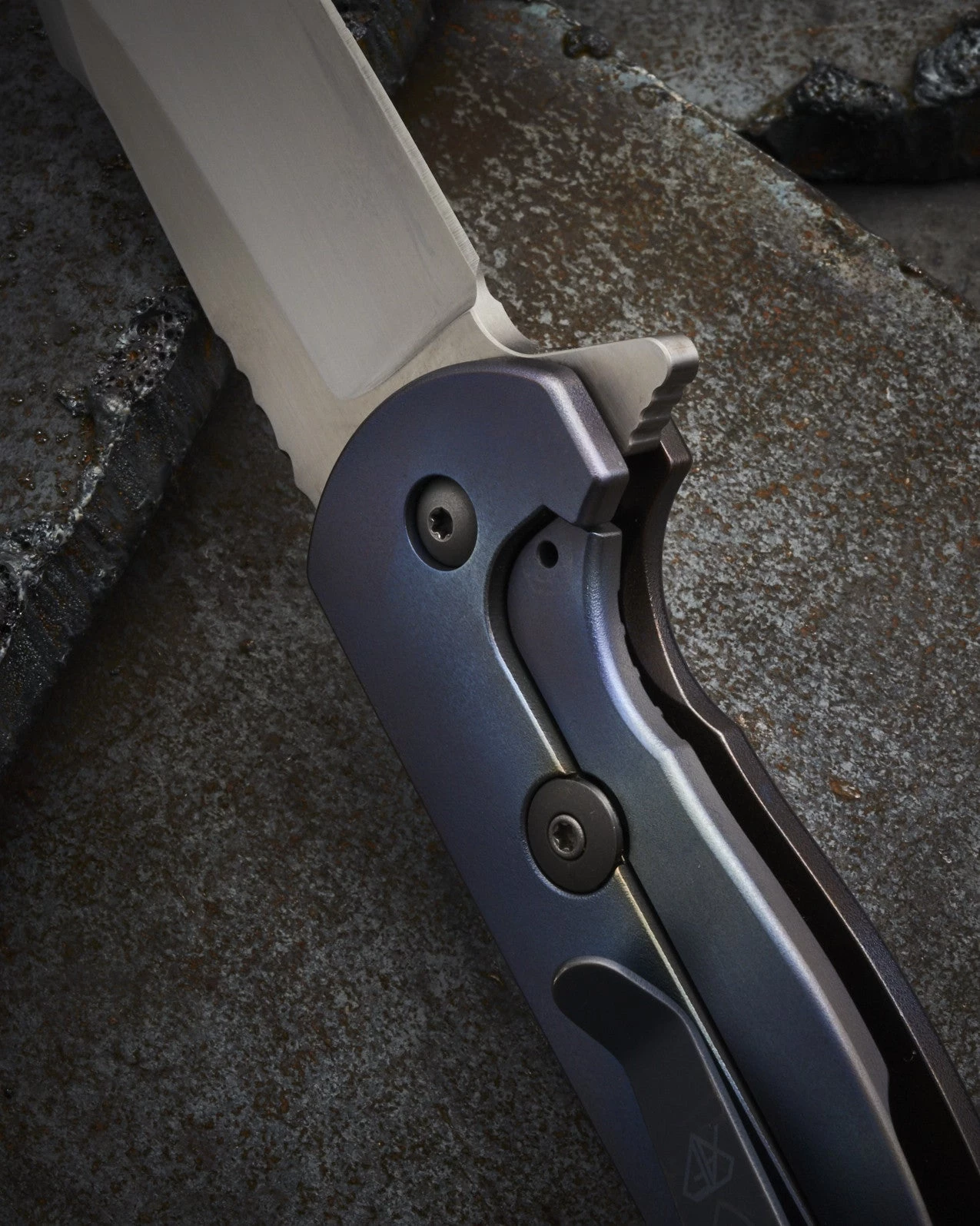Handle – 5″ Anodized Titanium Scales with Milling. Geared Moku-Ti Backspacer. Includes two other backspaces which are Orange and Black.Â