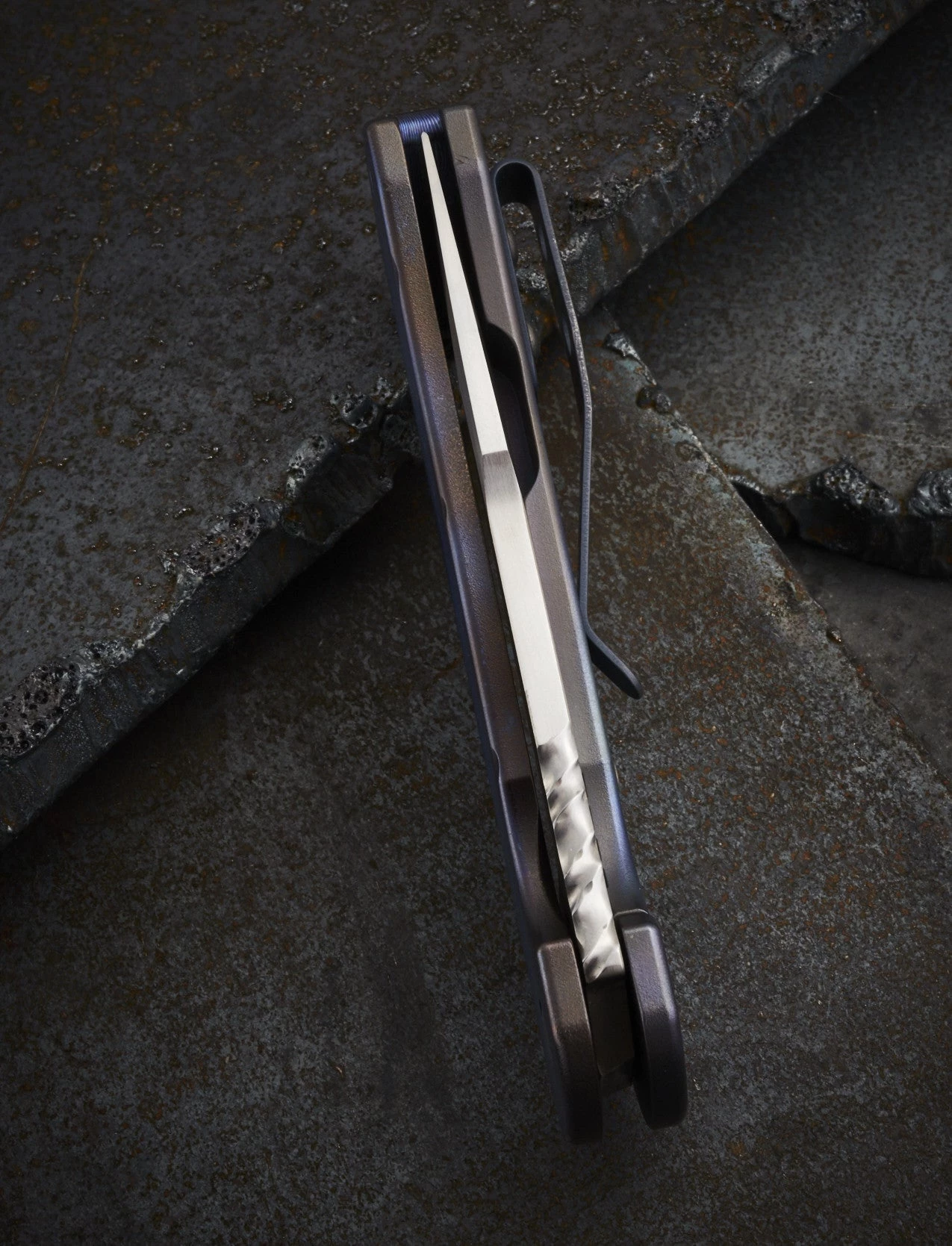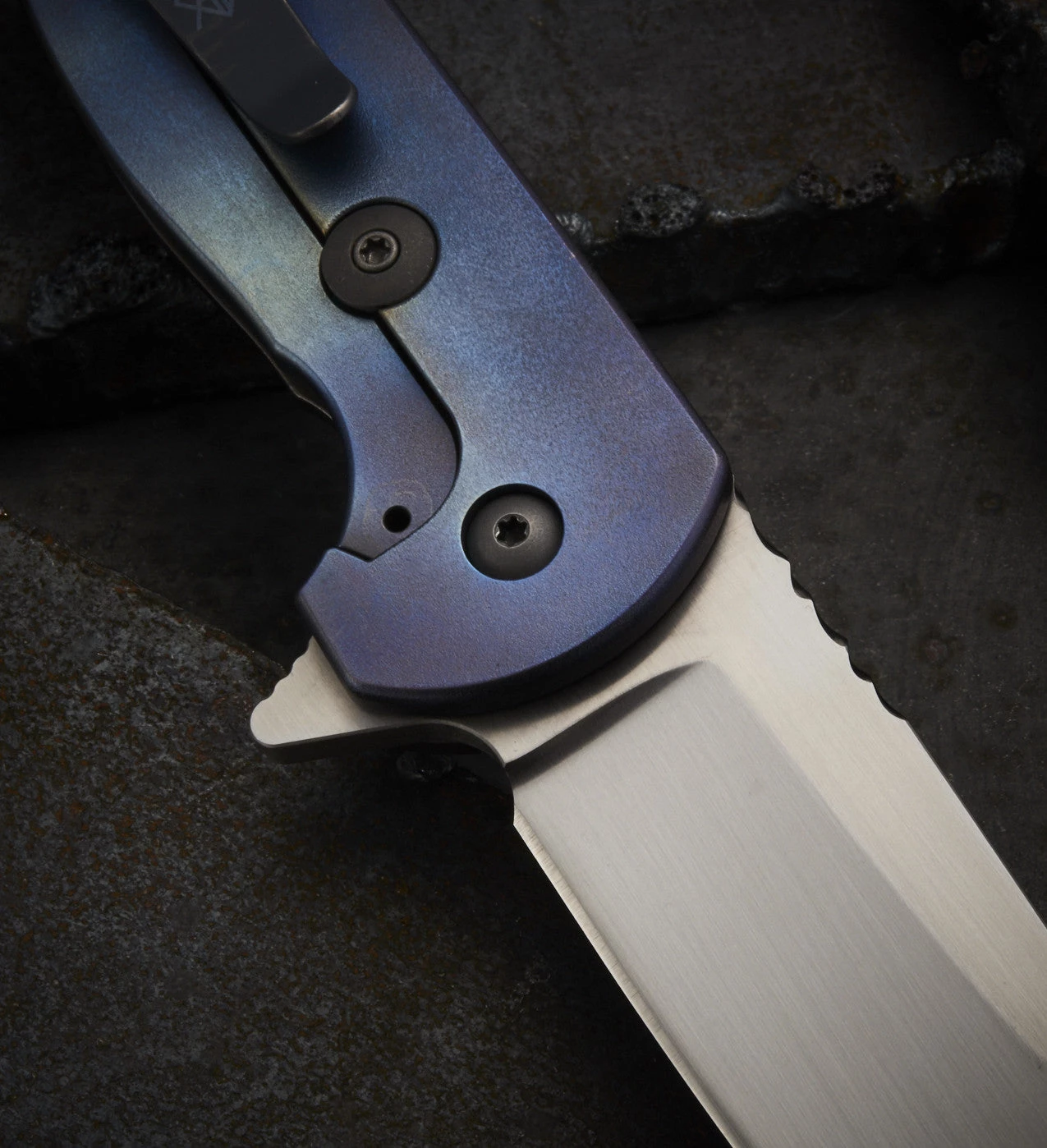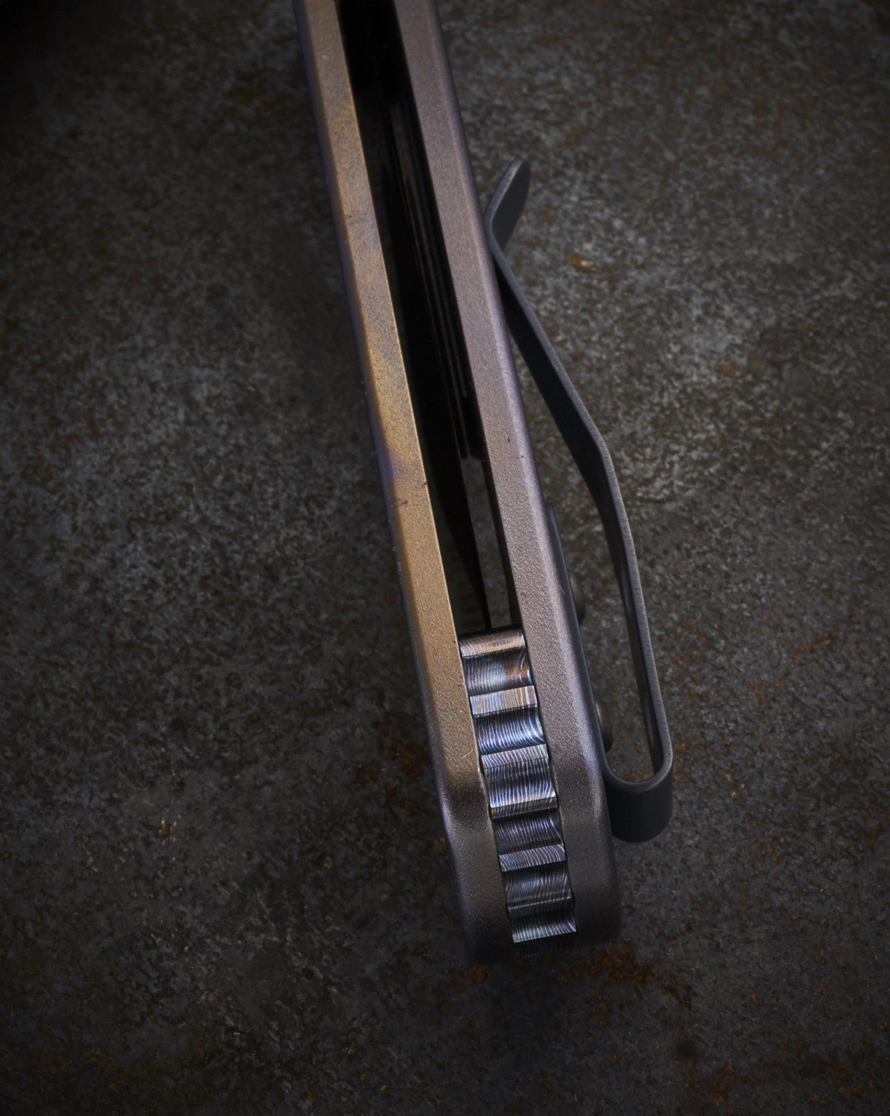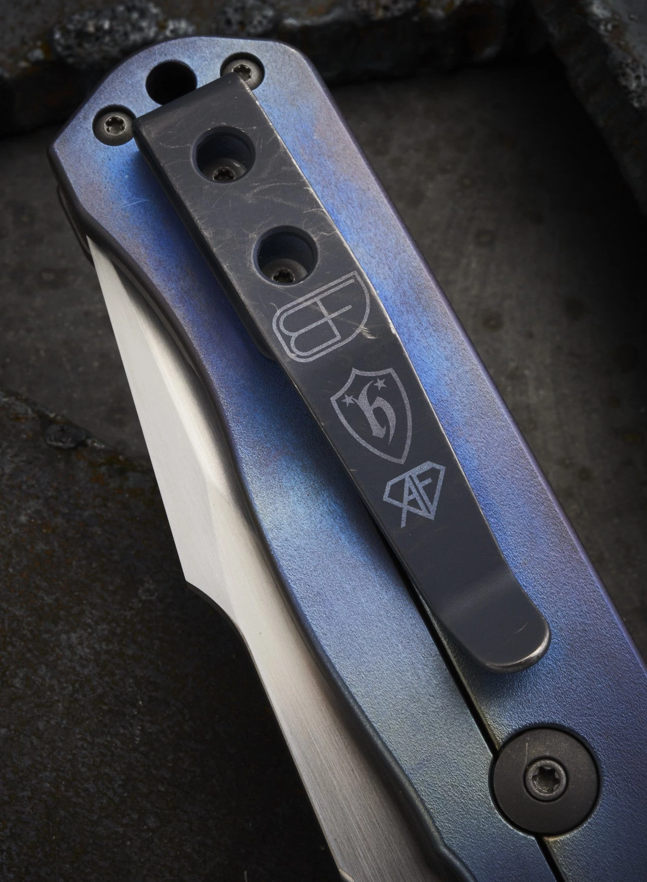 Handle – 5″ Anodized Titanium Scales with Milling. Geared Moku-Ti Backspacer. Includes two other backspaces which are Orange and Black.Â