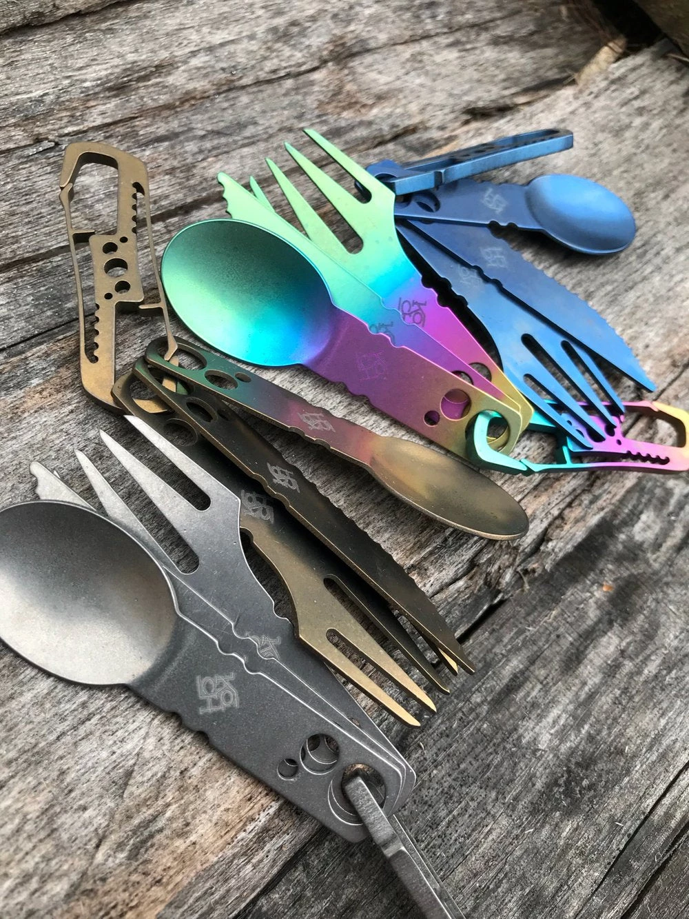 “TiWare is a new project I came up with that I hope you guys all enjoy. I wanted to come up with a small compact backup set of silverware that would be lightweight, durable and anti corrosive for various situations. These are perfect for a go bag , keep a set at camp , in the boat or wherever you think makes sense. I had a few thoughts on how to keep them all together and Spectrum Energetics came up with this double carabiner which couldn’t be more perfect for this line along with their form molding of the spoons. I made sure there was enough room on them to add a few additional pieces to these in the future , or in case there is something else you want to throw on there. Each utensil is roughly 3” in length. Last but not least these are Made right here in Pennsylvania. ‘ – Koch Tools