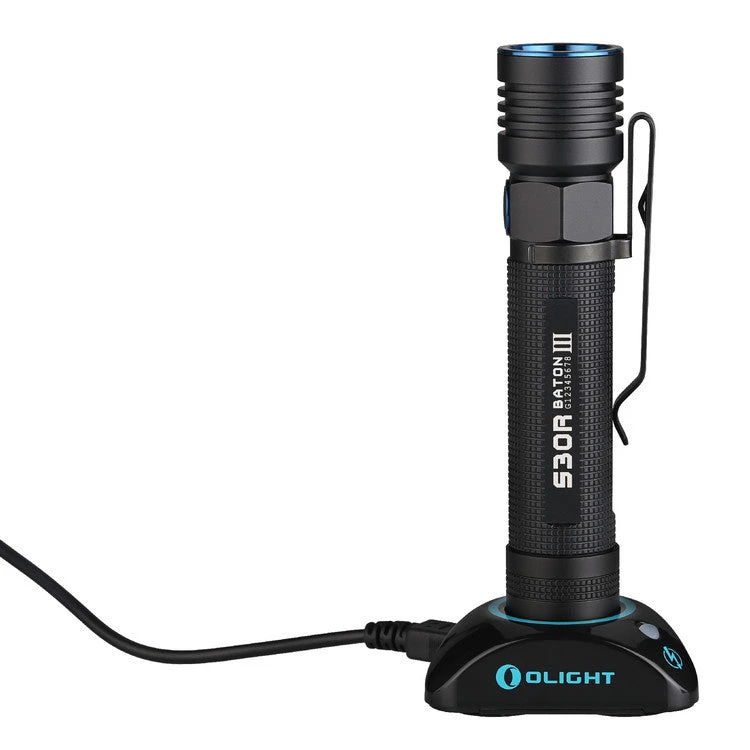 - New USB desktop charging dock provided. This flashlight also has a charging port that is compatible with Olight magnetic charging cables which can be used for charging on the go