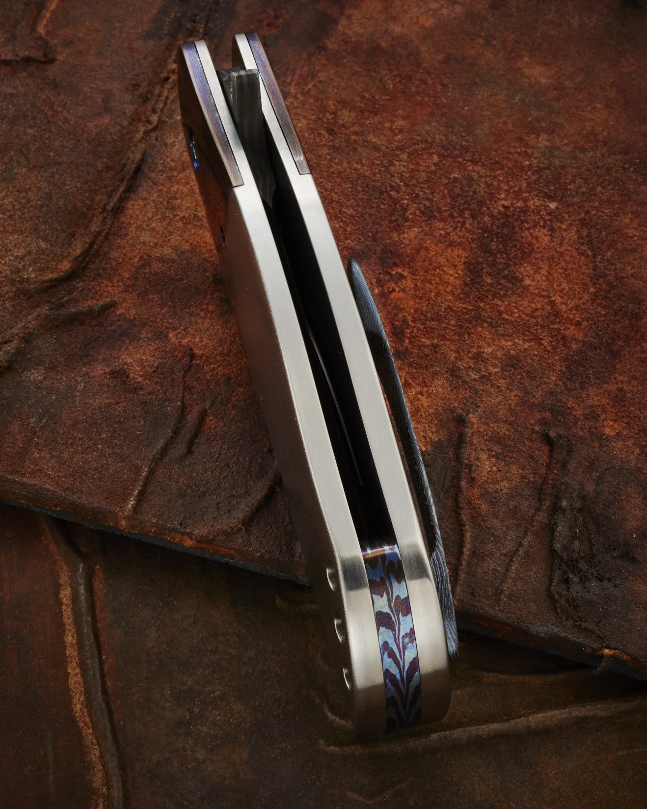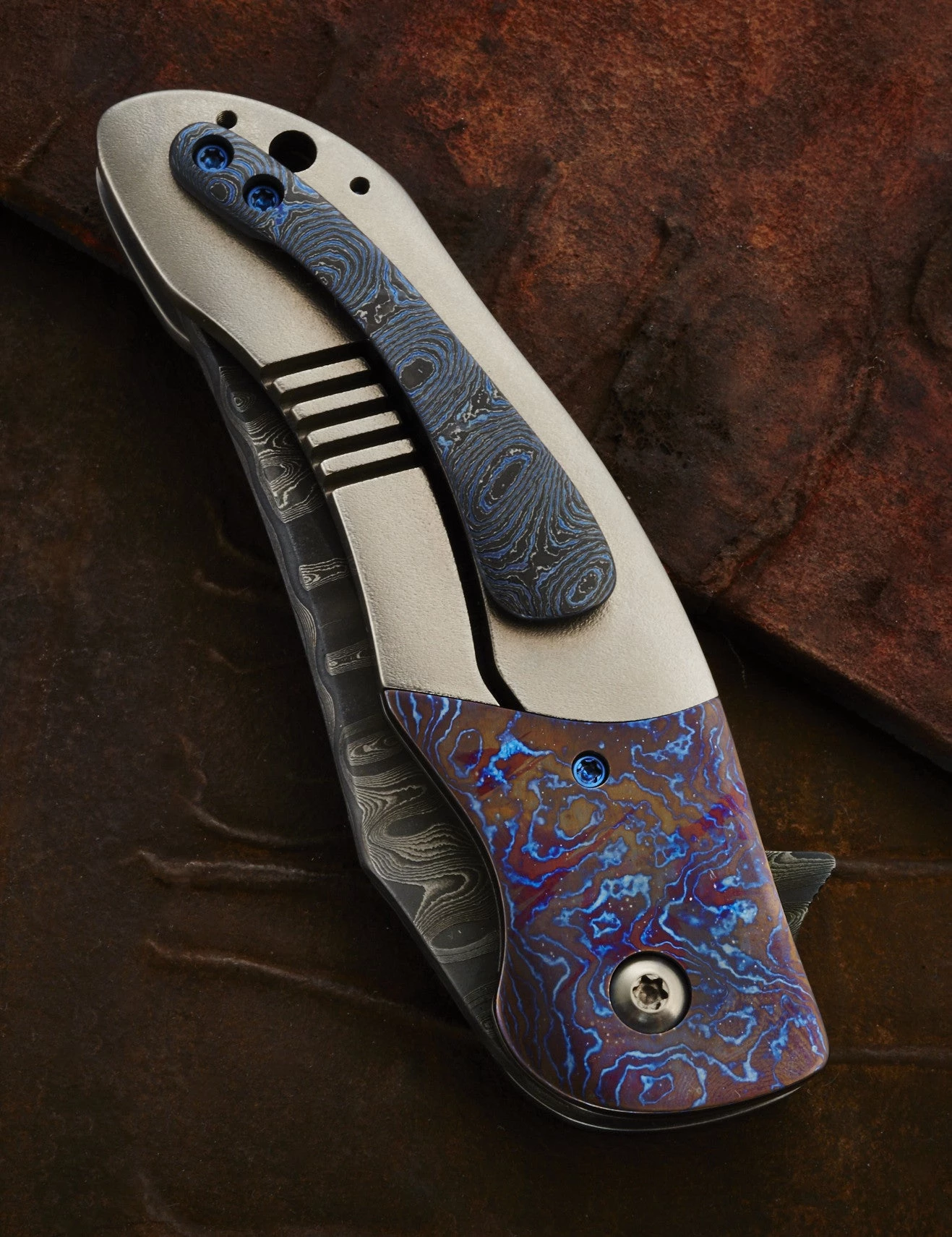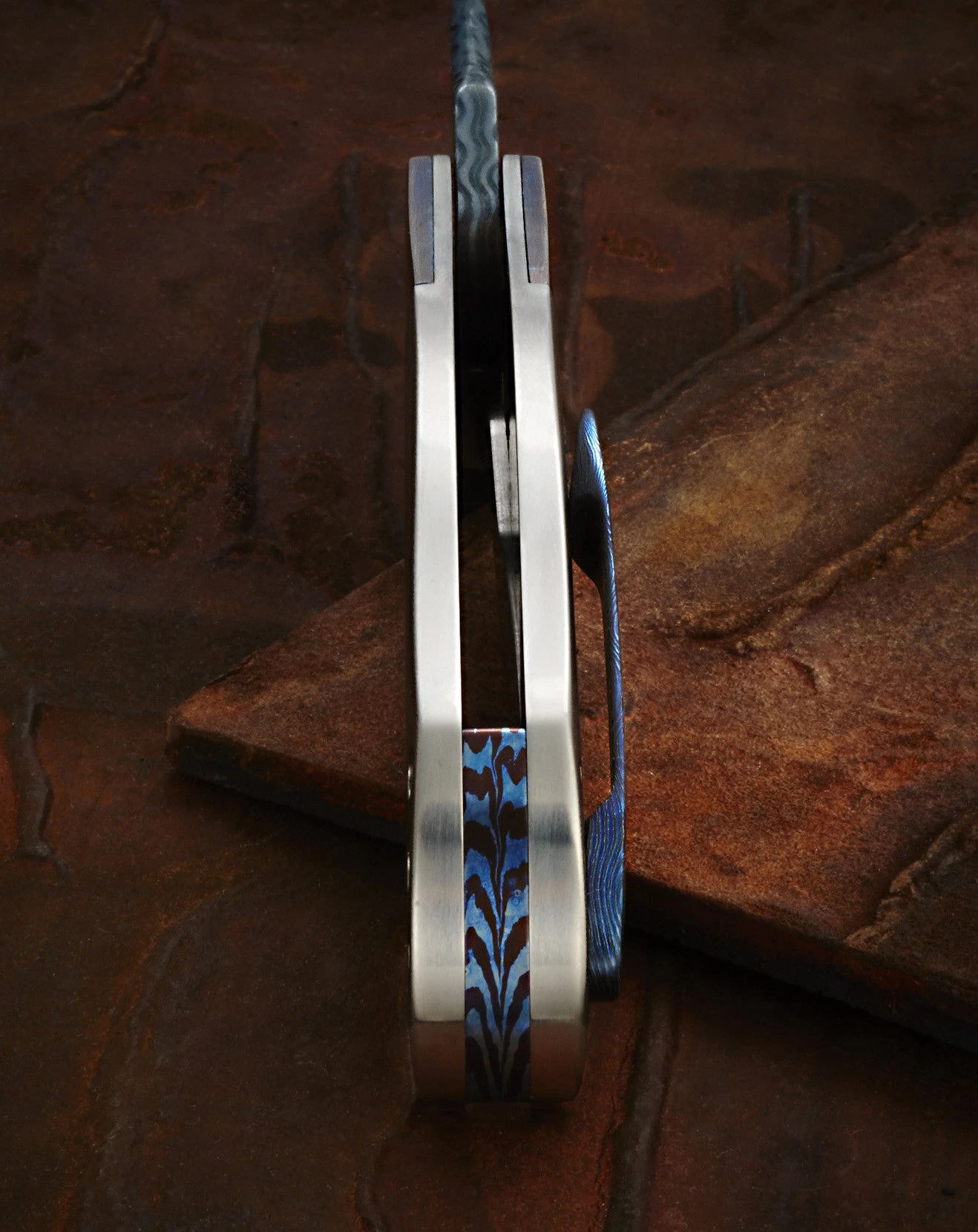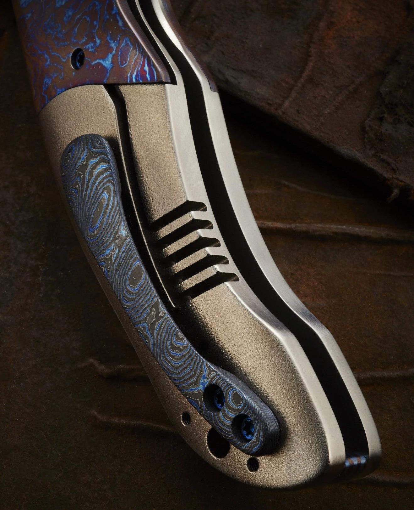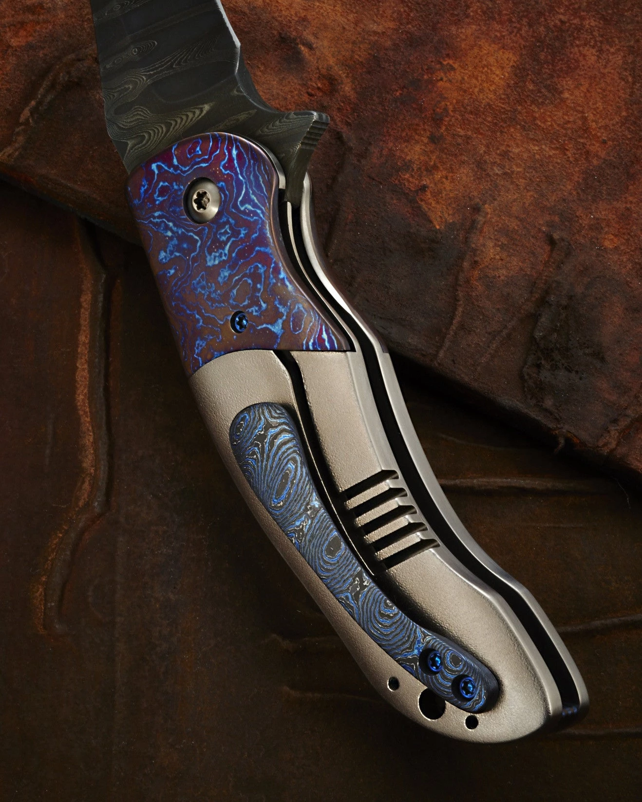 Handle –Â 4.75″Â Â Orange peeled titanium frame with timascus Bolsters, Pocket Clip and Backspacer.