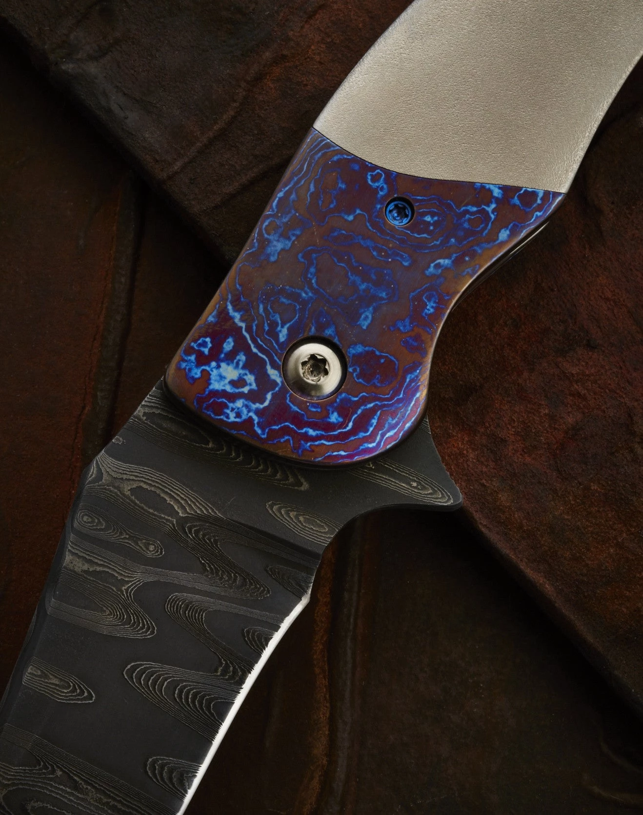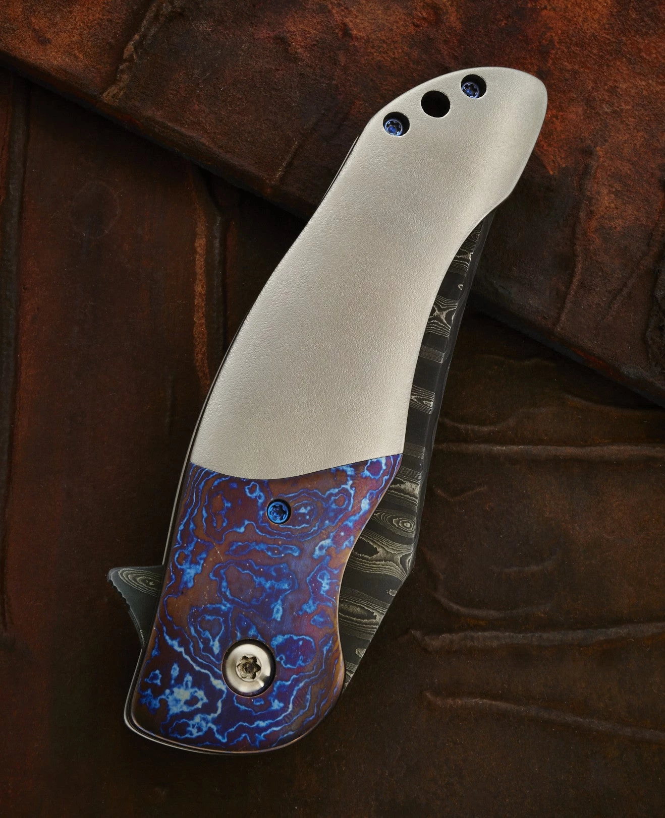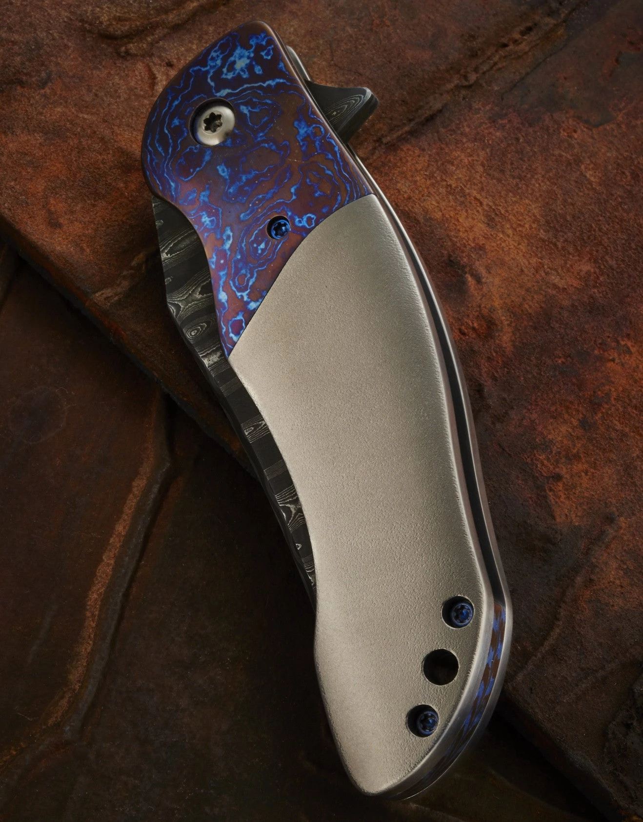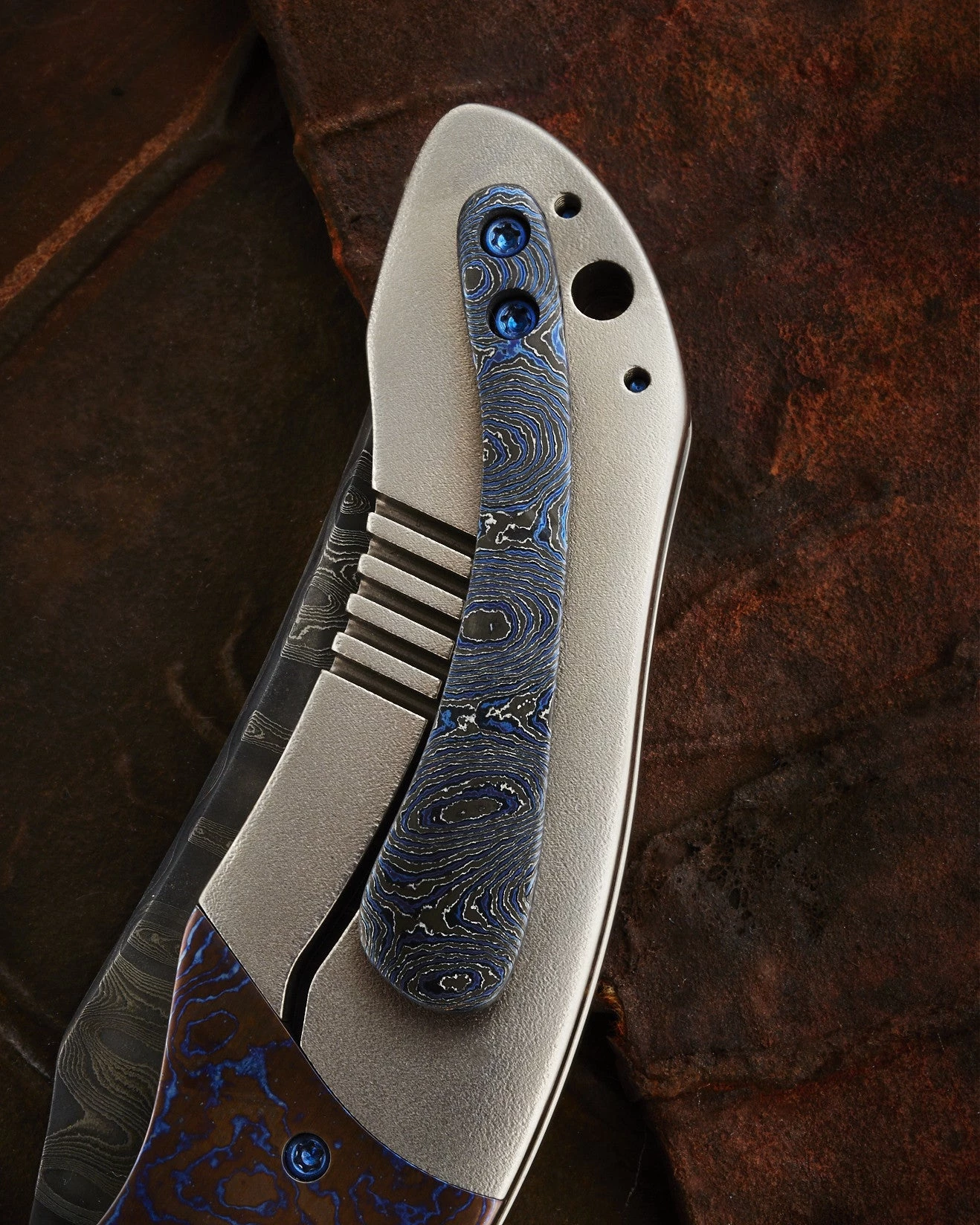 Handle –Â 4.75″Â Â Orange peeled titanium frame with timascus Bolsters, Pocket Clip and Backspacer.