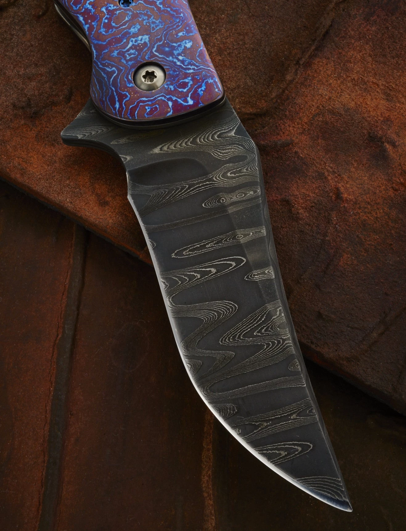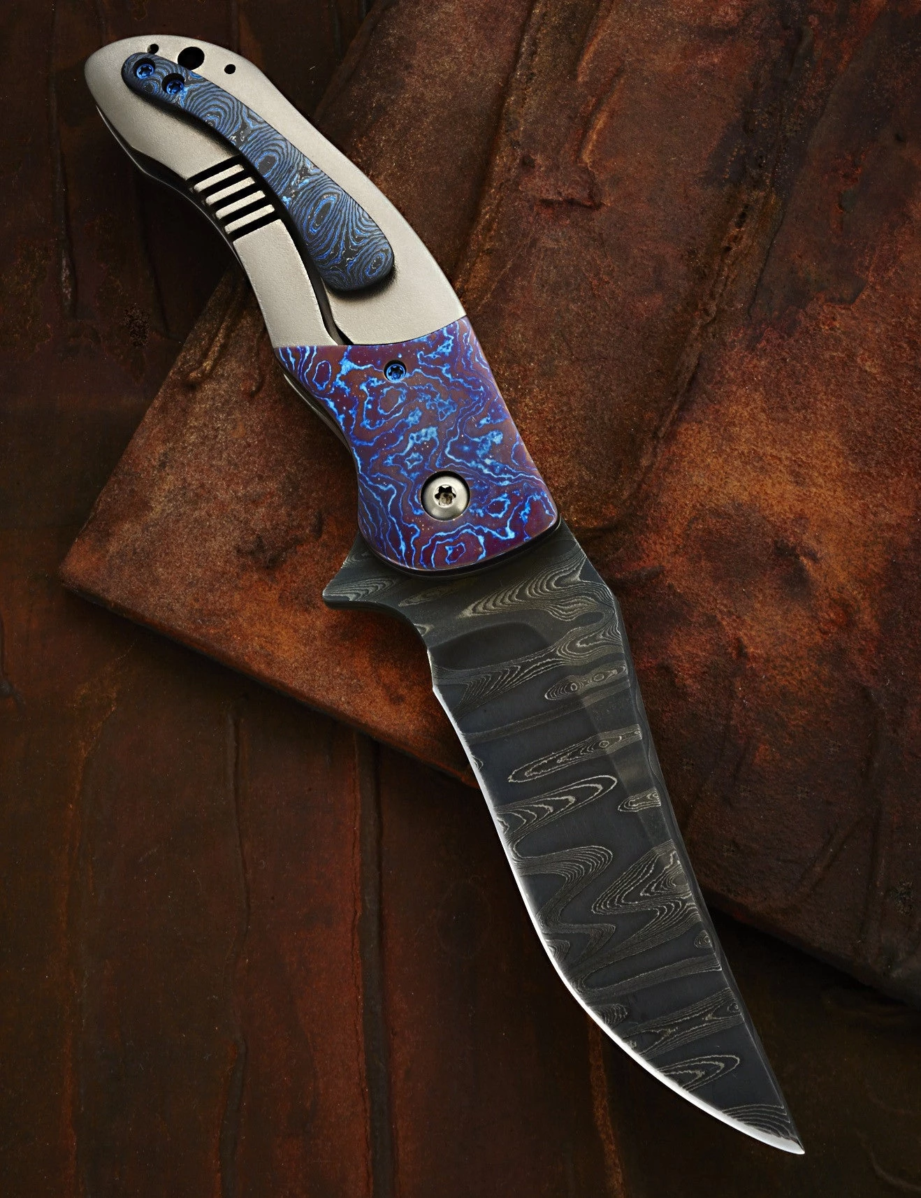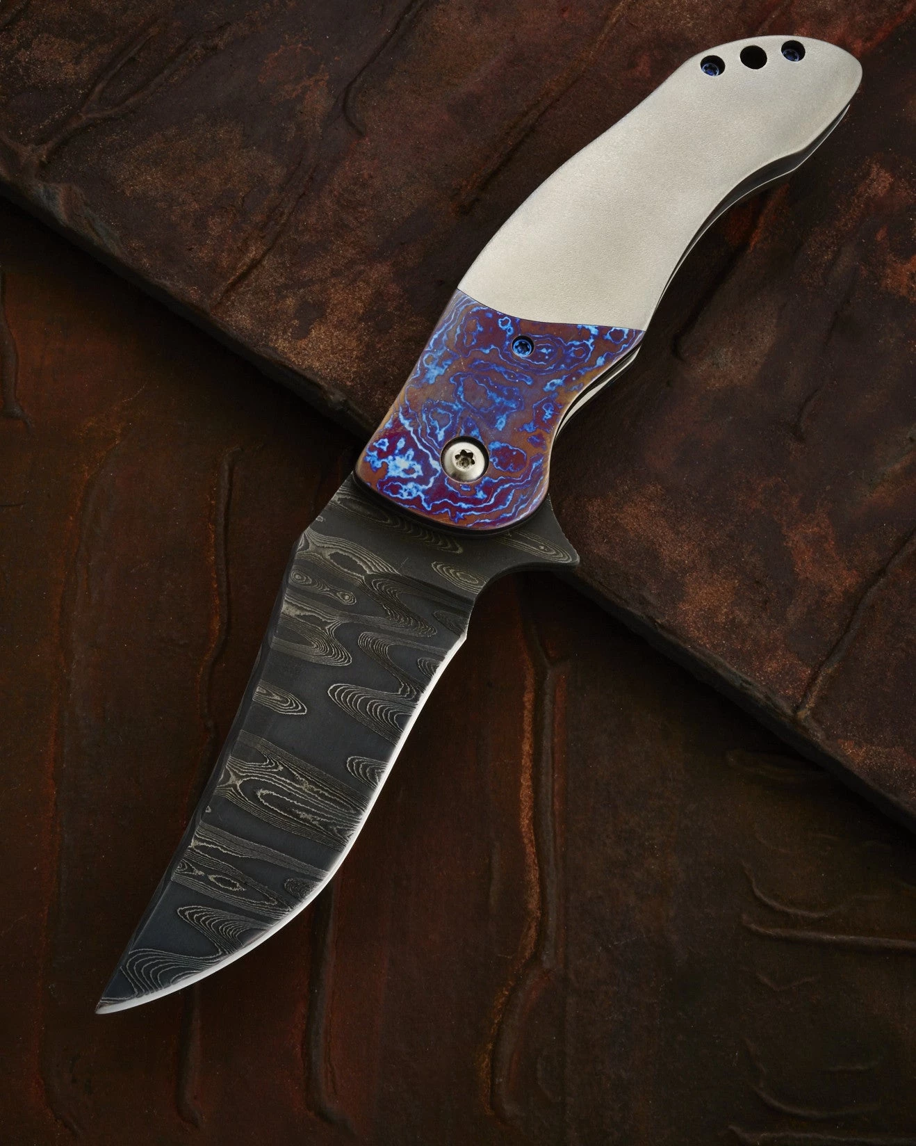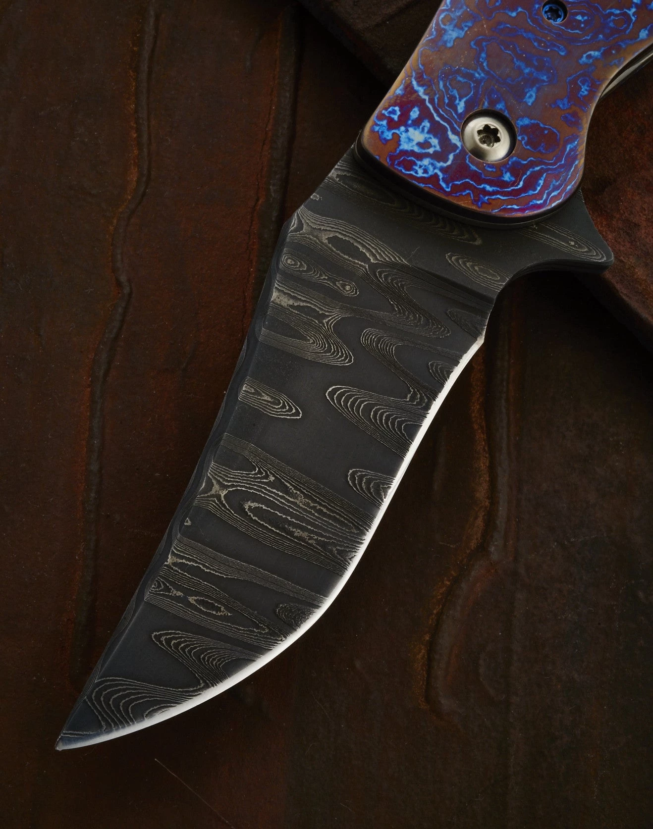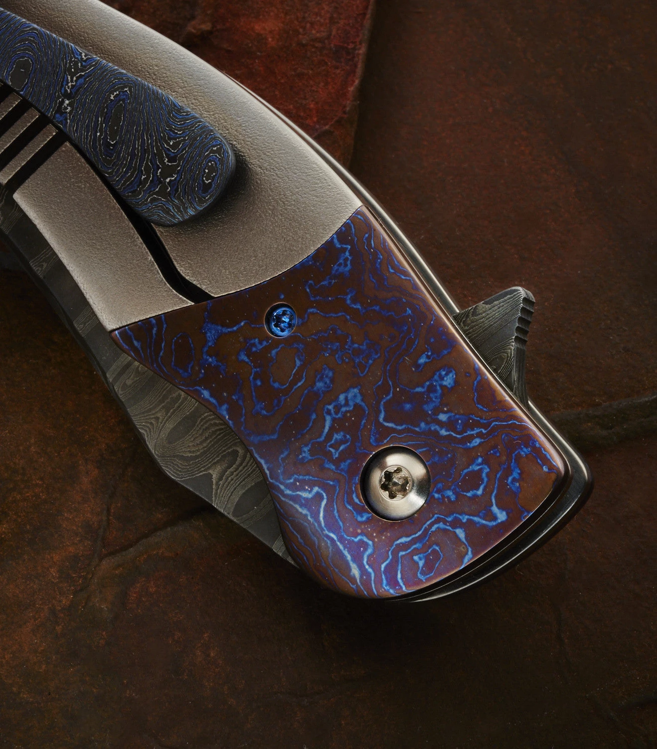 Handle –Â 4.75″Â Â Orange peeled titanium frame with timascus Bolsters, Pocket Clip and Backspacer.