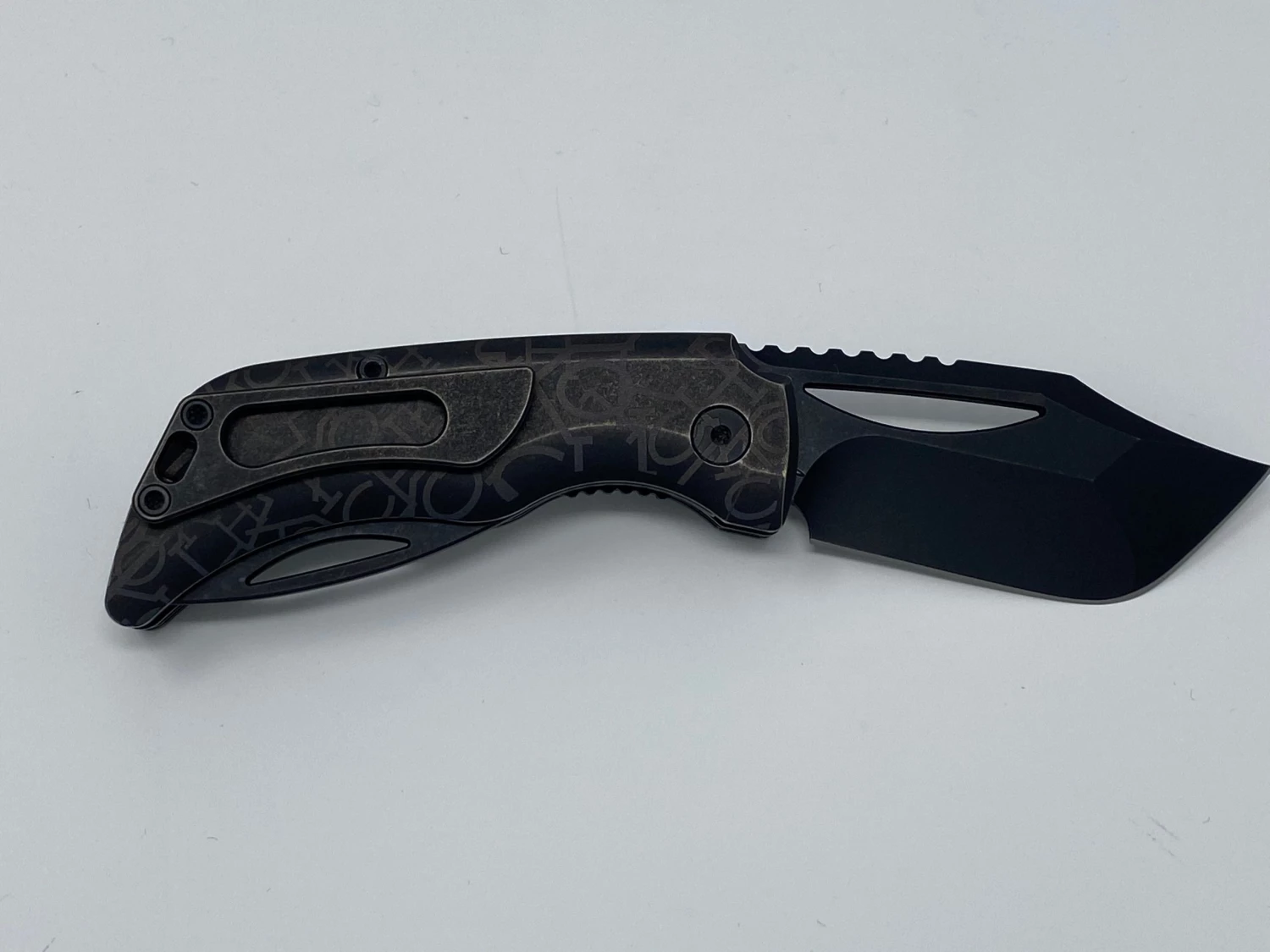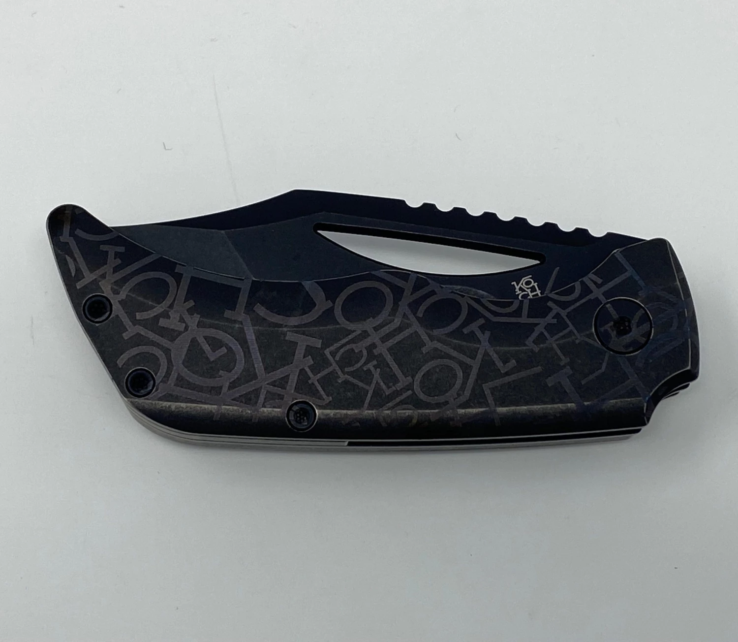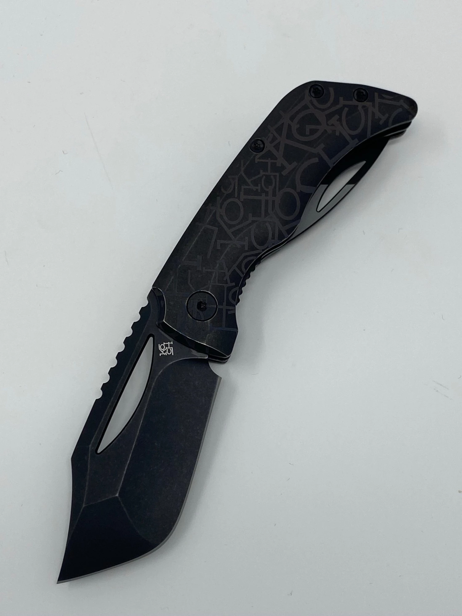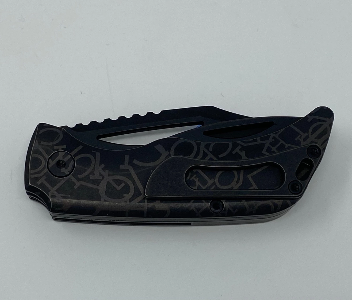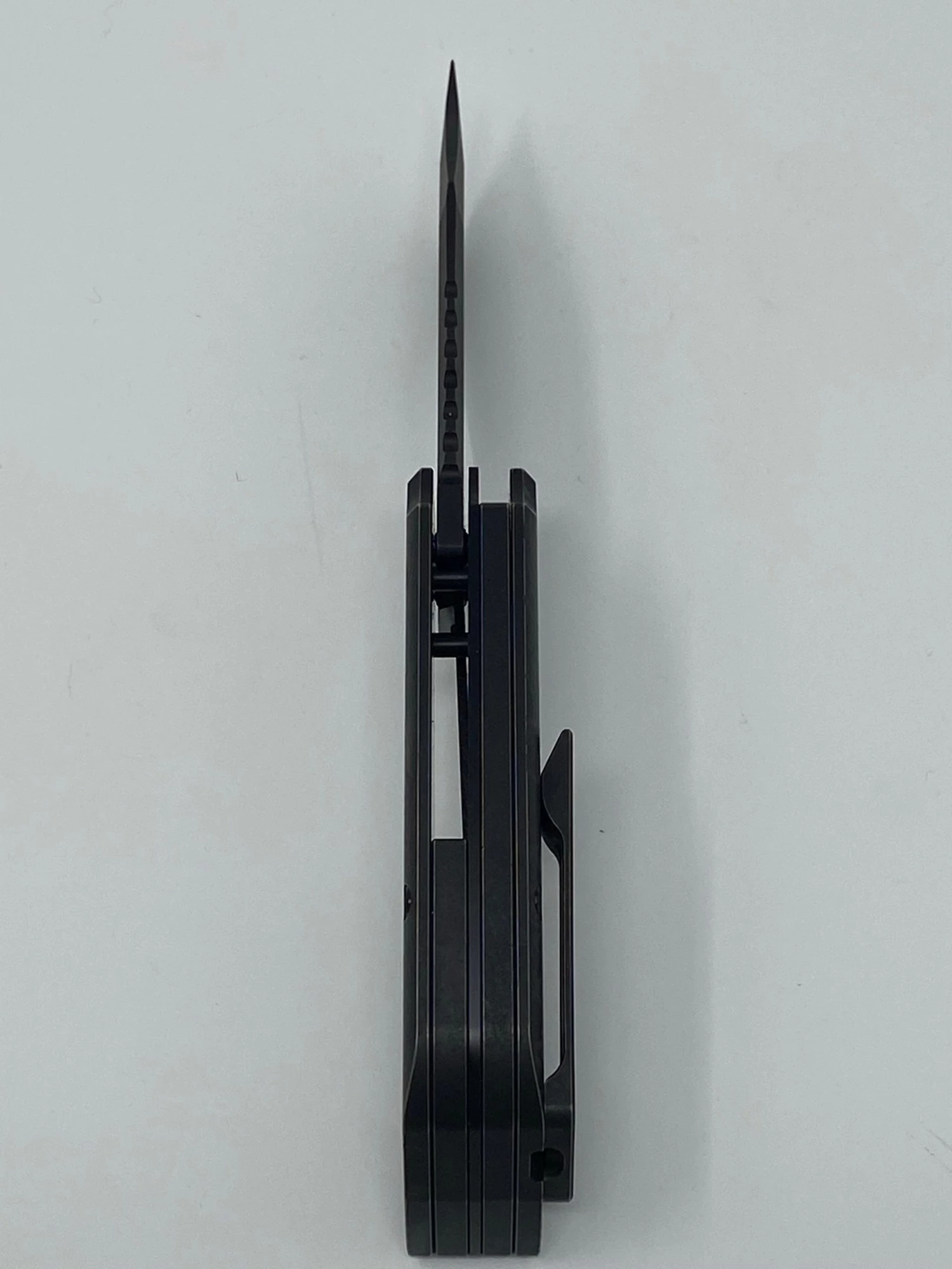 Handle – 3.5″ (5/8” wide) Exclusively lasered Blackwashed Titanium Handles on a Steel Chassis. Titanium Clip and screws
