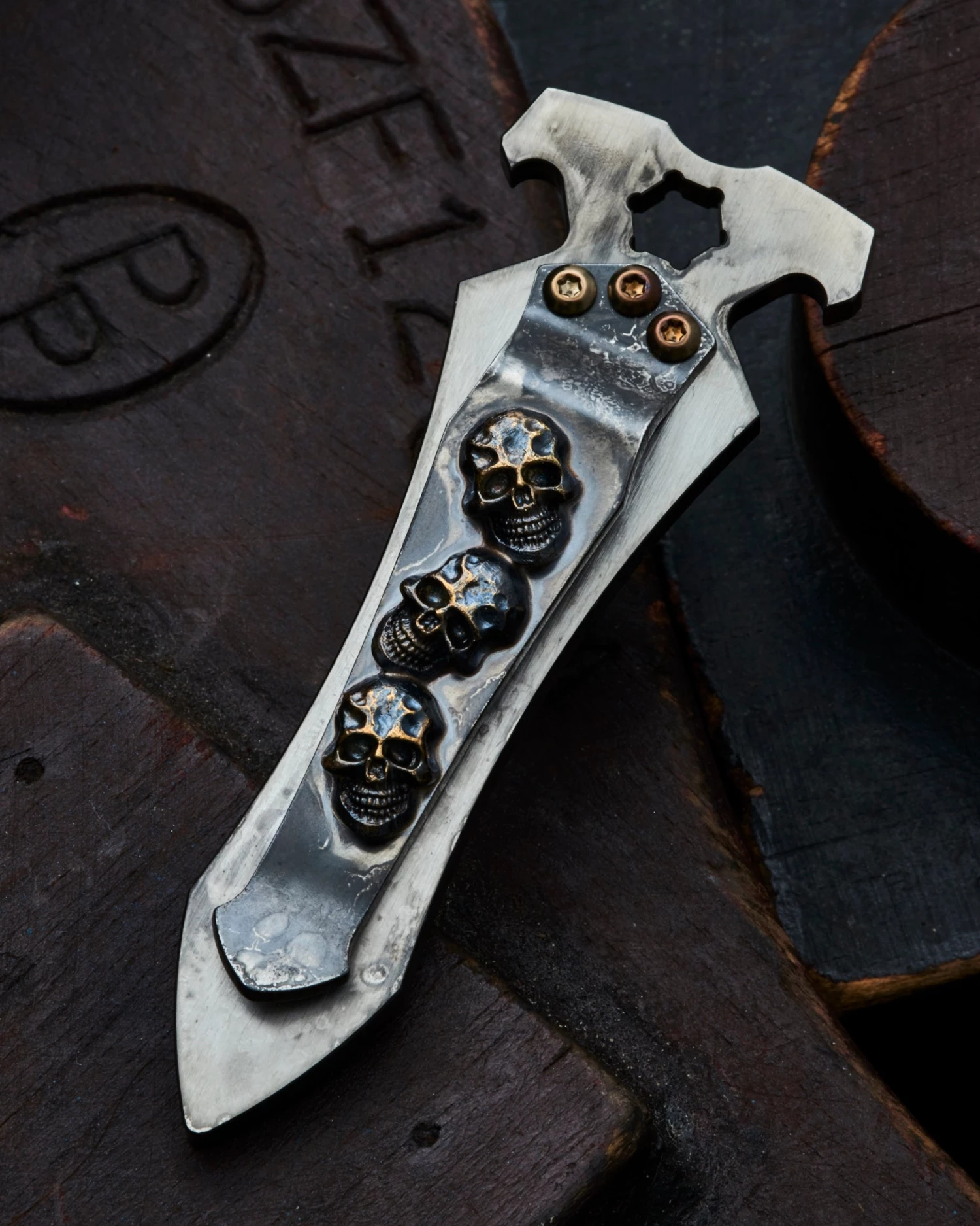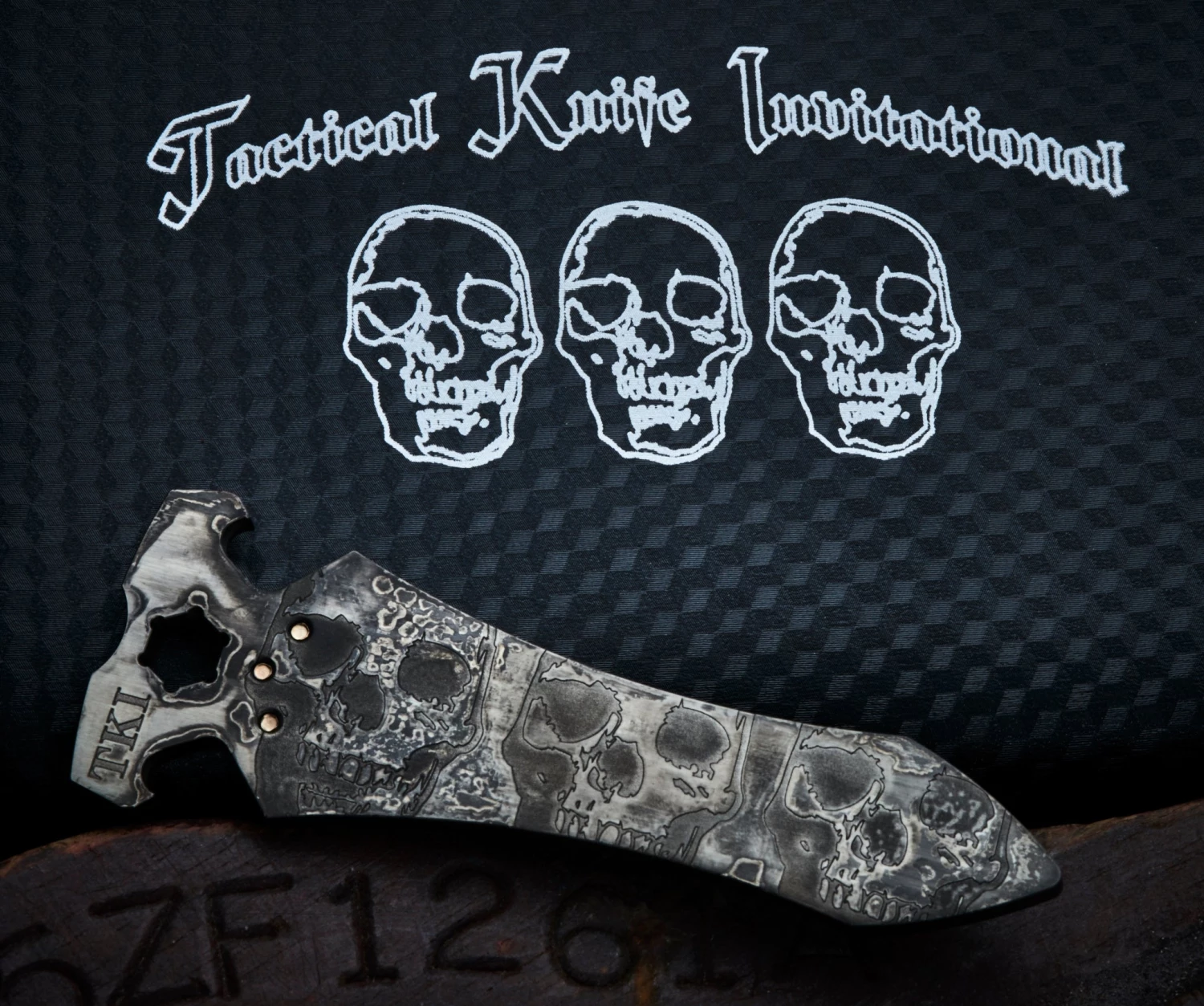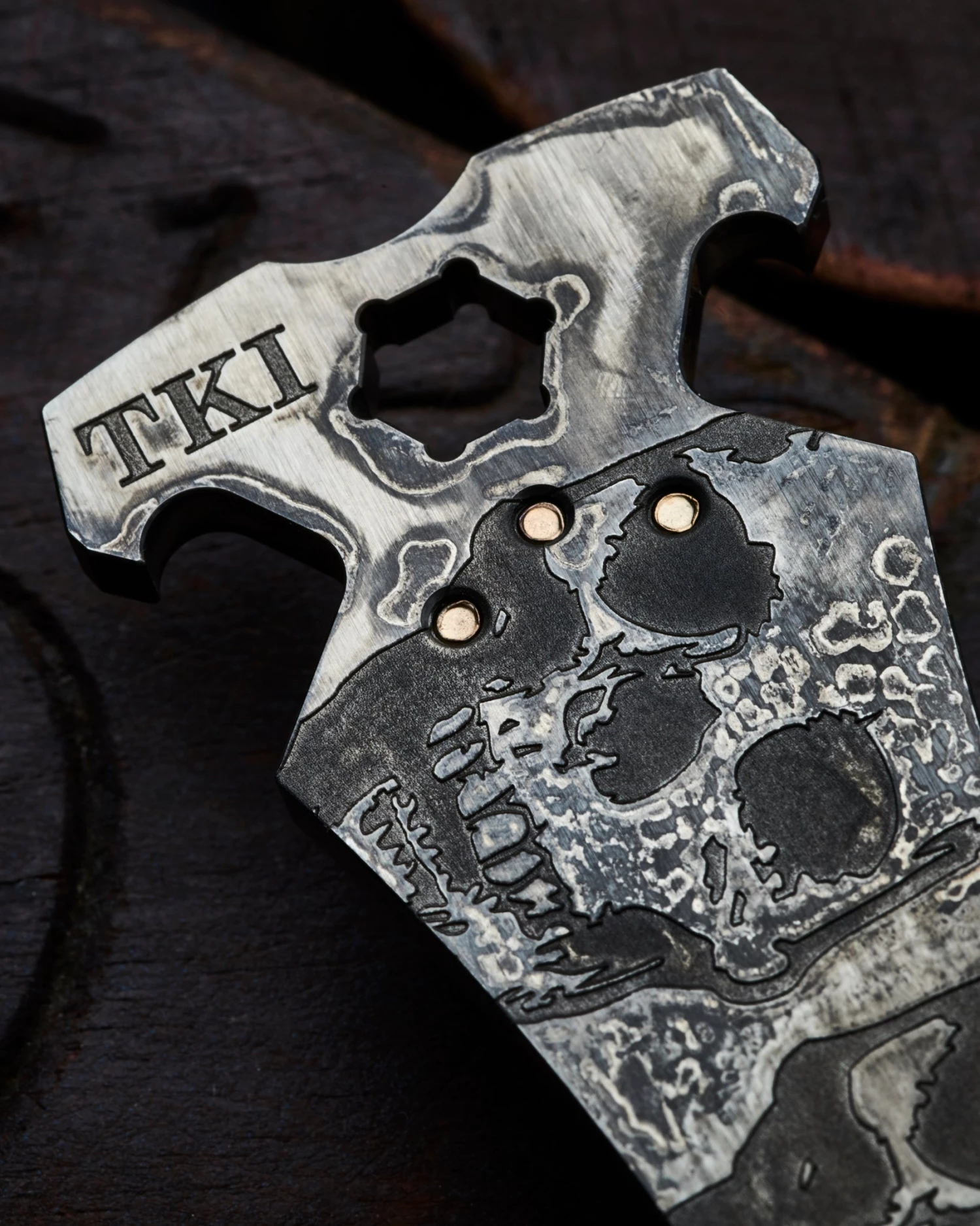 Info – SF trademark Darkness Skull pocket clip with TKI Skull logo on reverse side. All in One Money Clip, Bottle Opener, and Multi-tool which can hold a 1/4″ hex bit