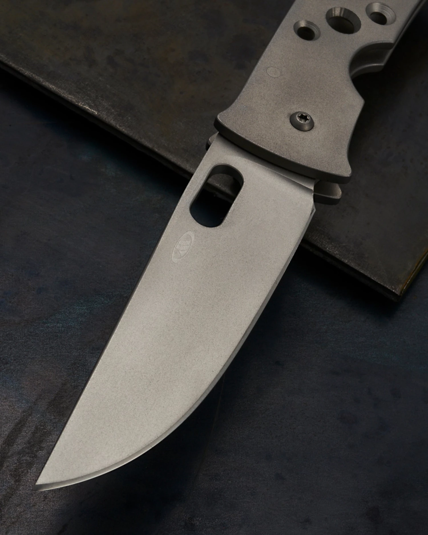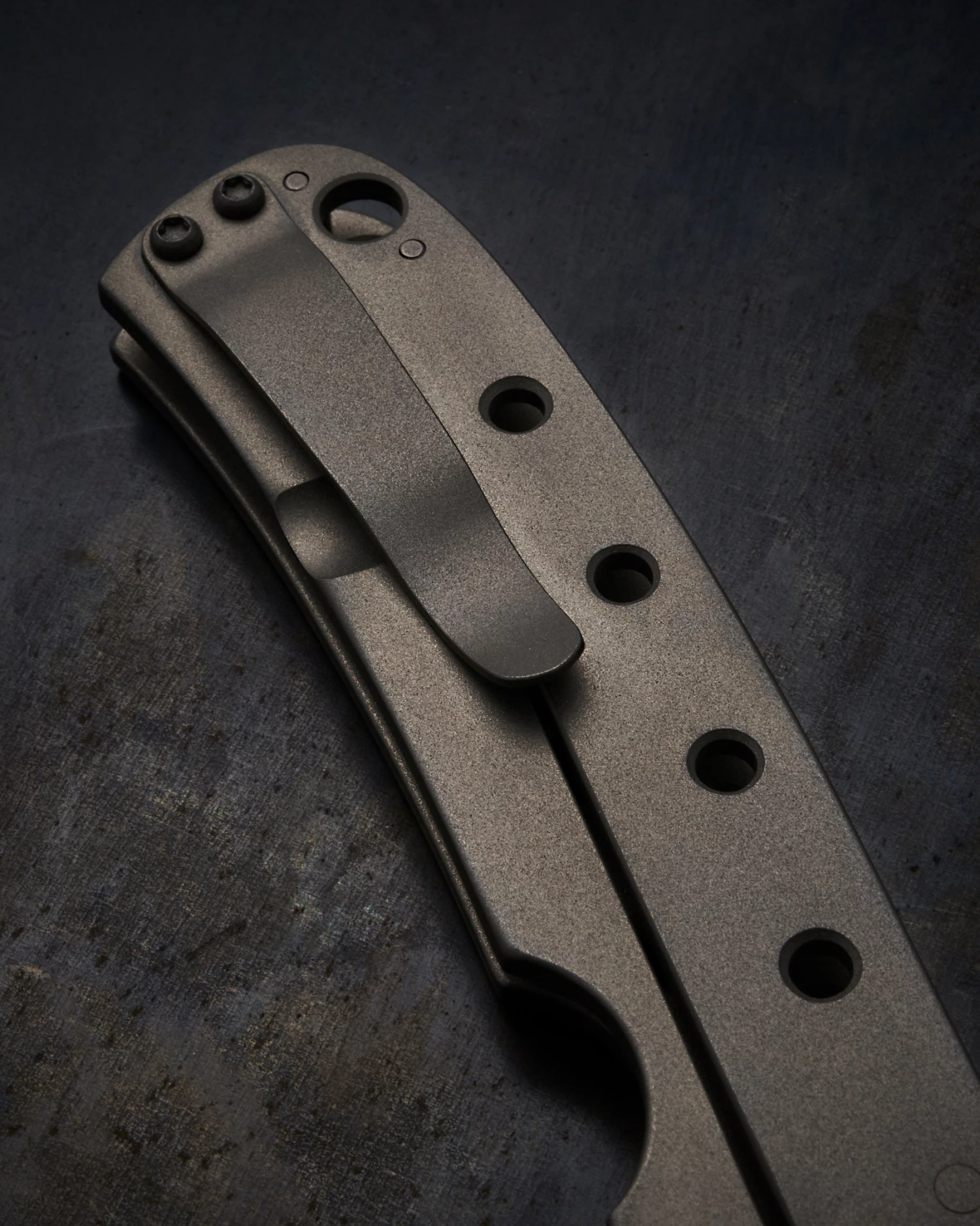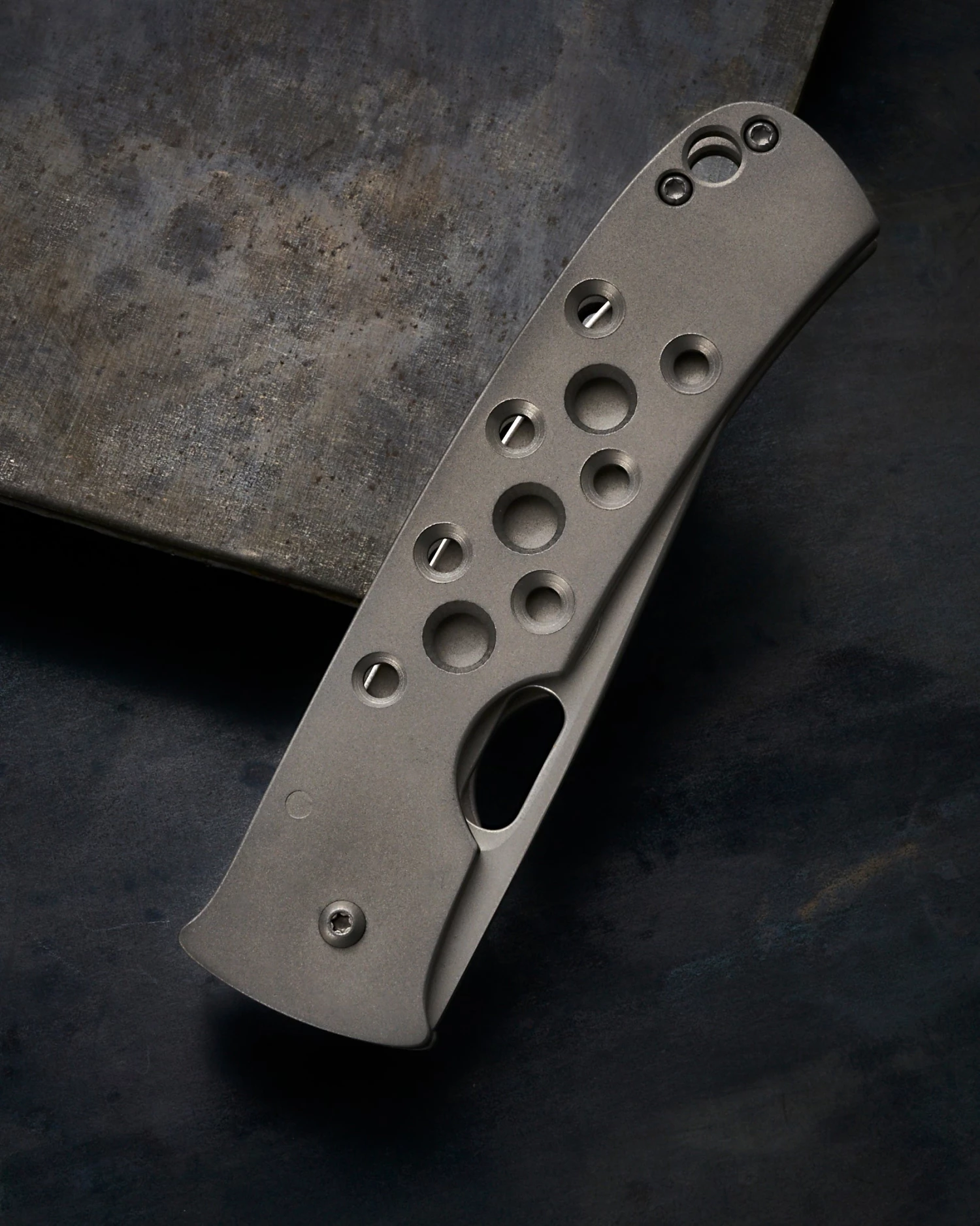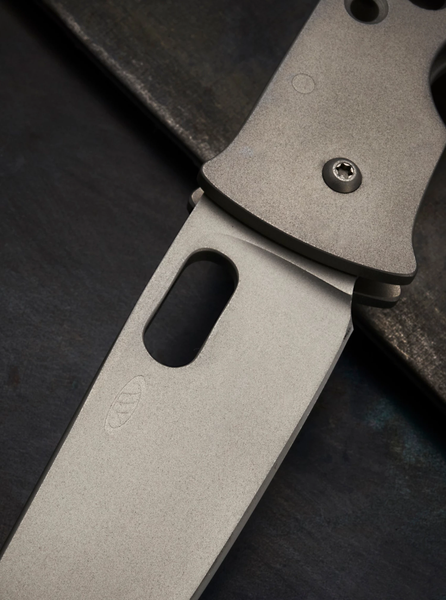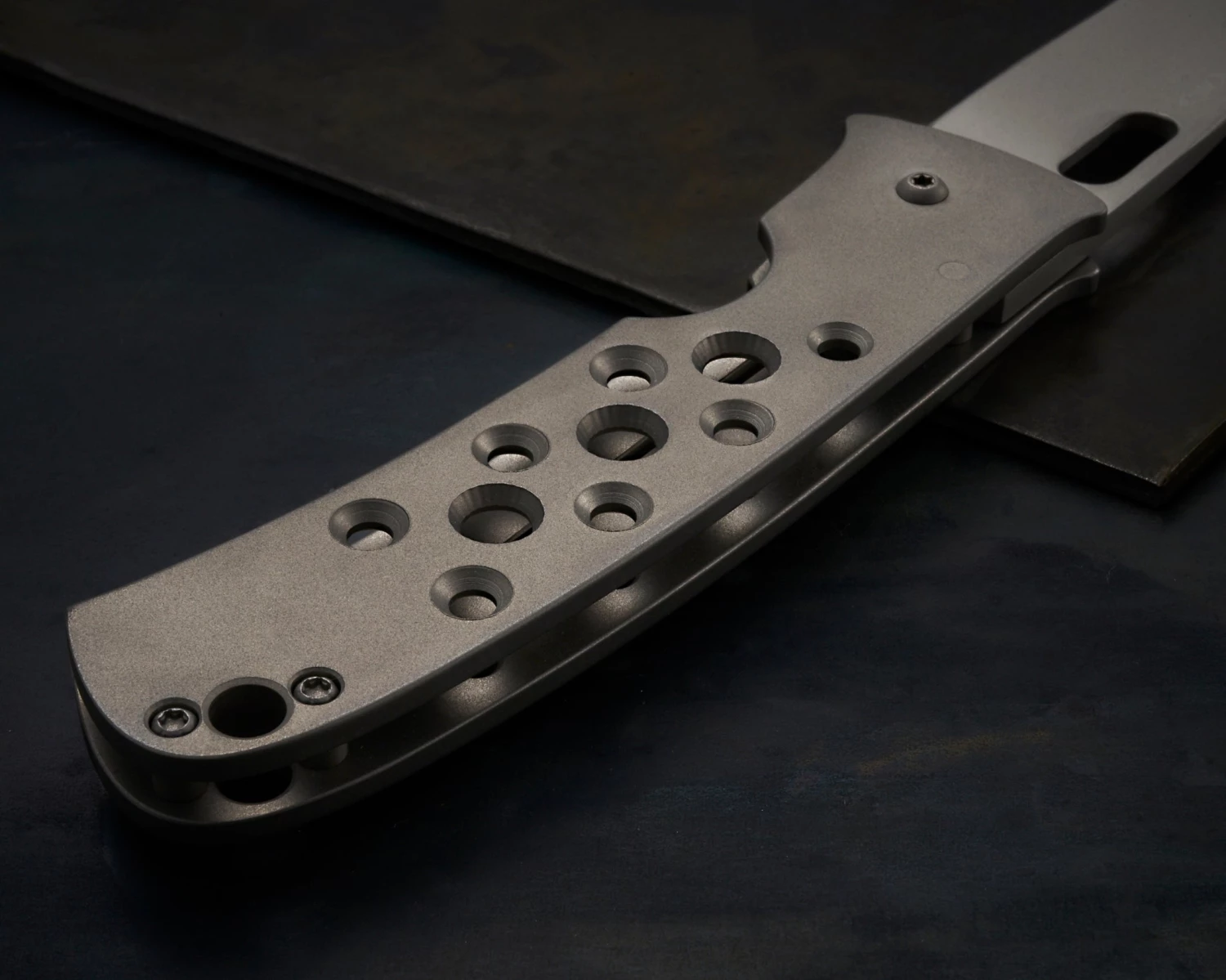 Handle – 4.8″ Bead Blasted Titanium with Mayo holes on show scale. Titanium Hardware