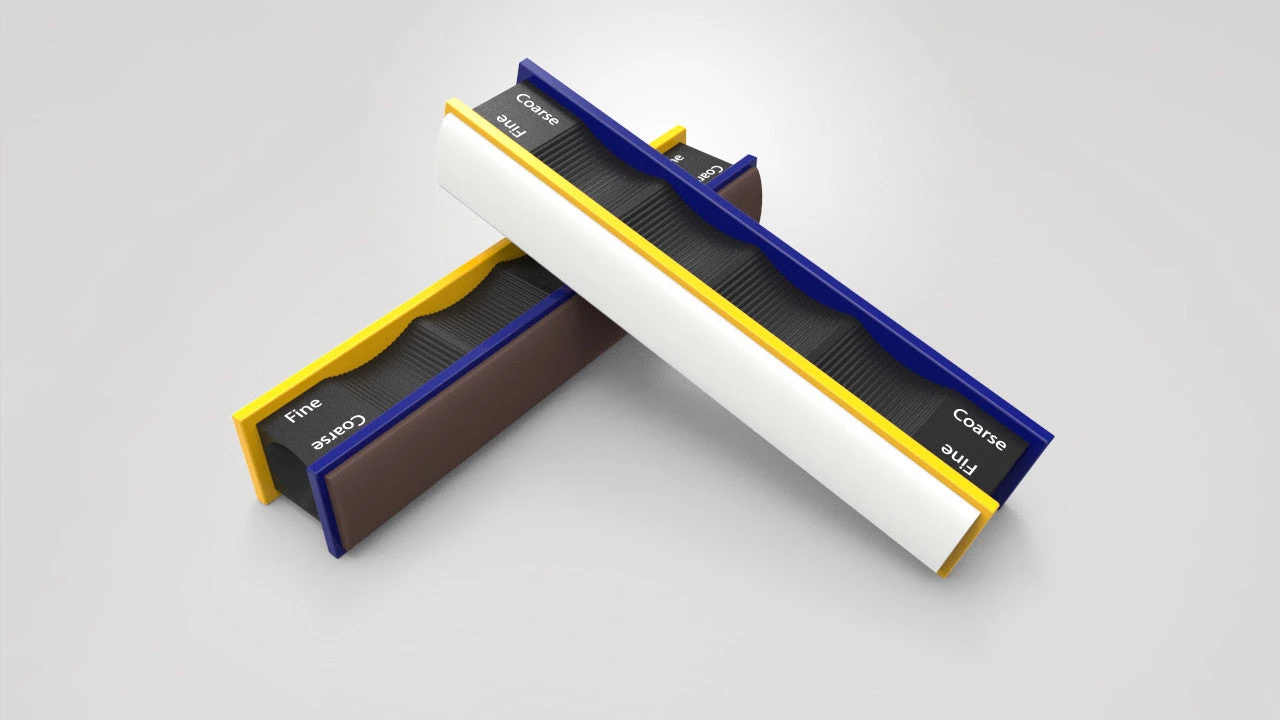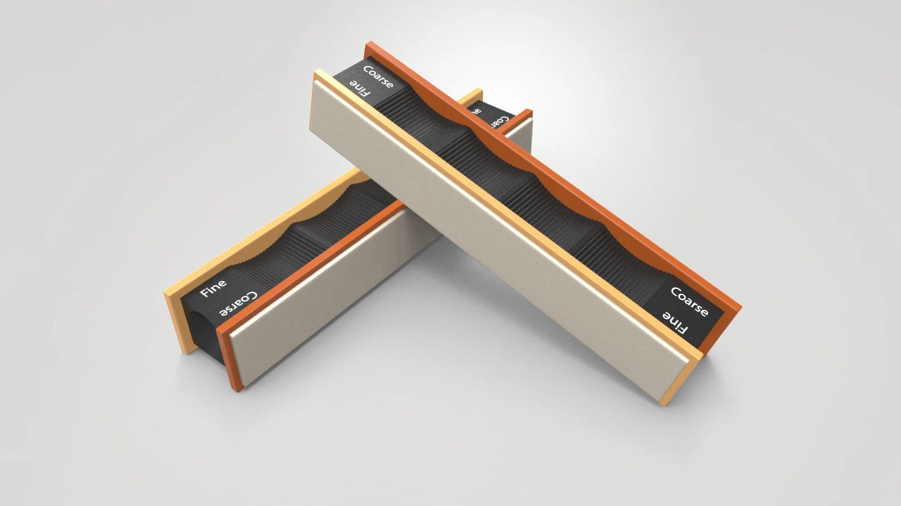 Grey & White – These Super Fine ceramic stones, produced using a proprietary method, are excellent for putting a mirror edge on your blade. They are the perfect step between the diamond stones and the strops. Two grits 1200/1600 (2 each).Â